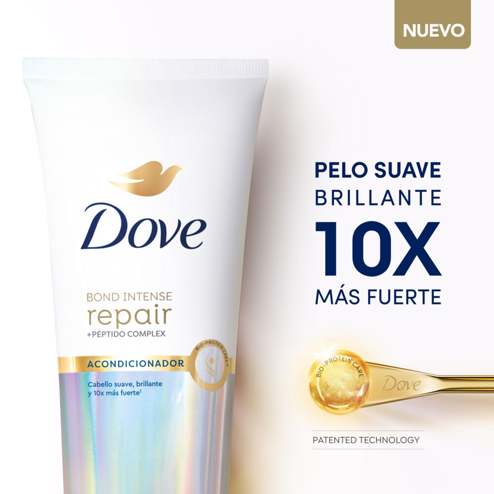 El nuevo acondicionador Dove Bond Intense Repair de 250 ml está diseñado para reparar y revitalizar la estructura interna del cabello a nivel molecular, gracias a su avanzada Tecnología Patentada Bio Protein Care y el exclusivo Péptido Complex. Este producto ayuda a la reparación interna sobre cabello decolorado, luego de 5 usos, devolviendo a tu cabello toda la vitalidad de un cabello natural. El uso regular de este acondicionador deja el cabello suave, brillante y hasta diez veces más fuerte.