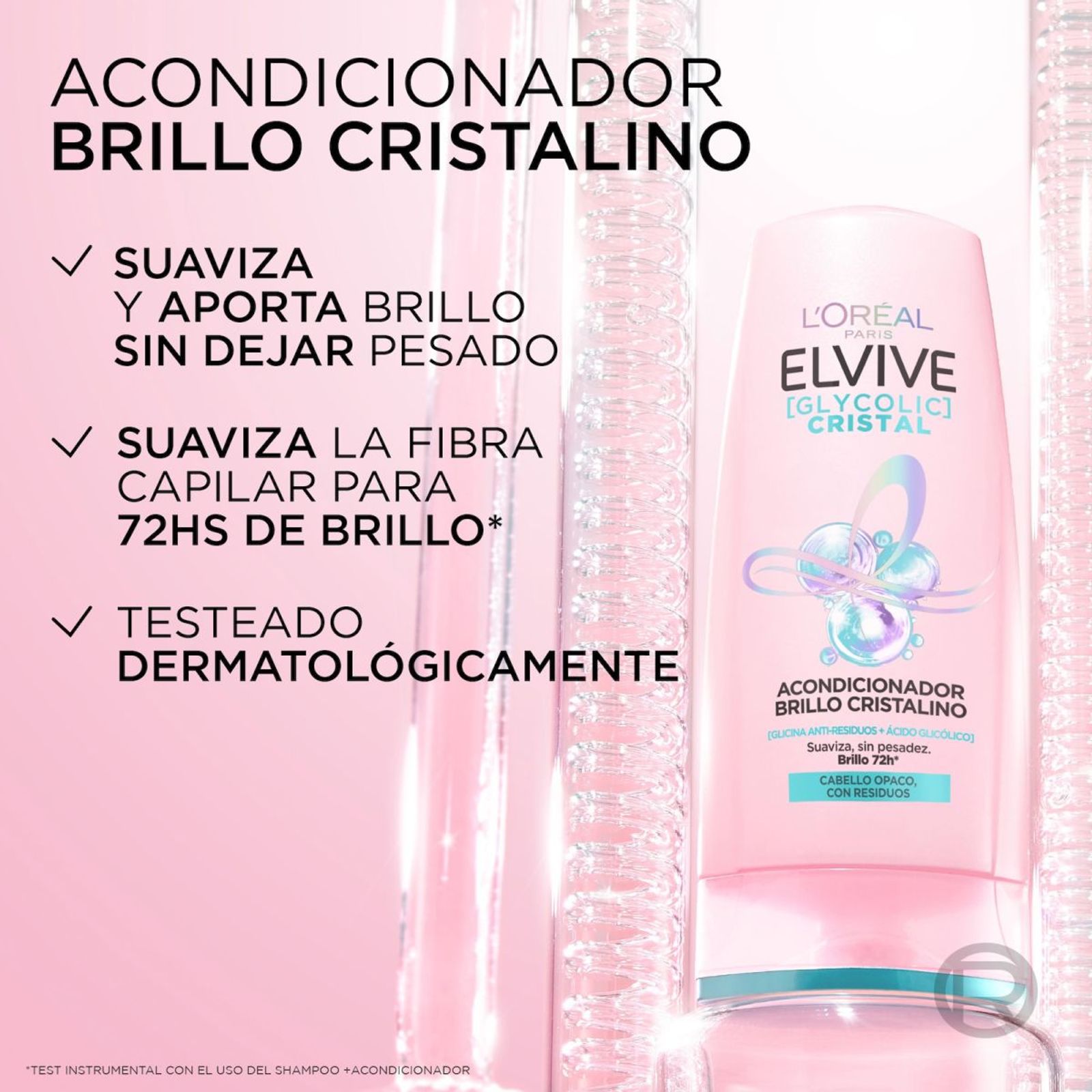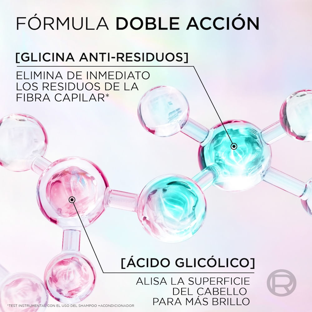 ¿Pelo opaco, pesado por residuos? Factores externos como la contaminación en el aire y en el agua, los tratamientos pesados y el uso recurrente de productos como uso recurrente de gel o la crema para peinar, recubren la fibra capilar de residuos dejando el pelo pesado e impidiendo la reflexión de la luz. Descubrí el acondicionador capilar Elvive Glycolic Cristal, potenciado con [Glicina Anti-Residuos + Ácido Glicólico], que suaviza tu pelo para lograr un brillo cristalino que dura hasta 72 horas* *Test instrumental, con el uso del shampoo + acondicionador