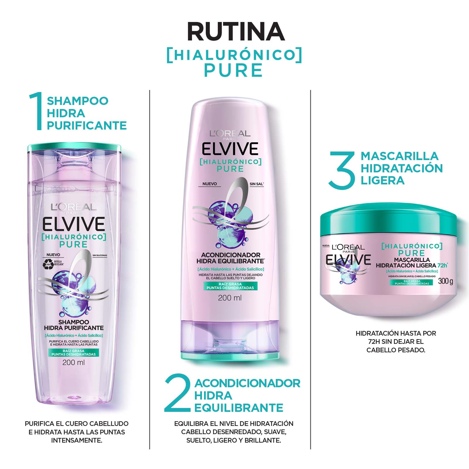 ¿Raices grasas y puntas deshidratadas? Empeza tu rutina con el nuevo shampoo Elvive Hialuronico Pure. Su formula con Acido Hialuronico y Acido Salicilico, purifica el cuero cabelludo e hidrata hasta las puntas por 72 hs.