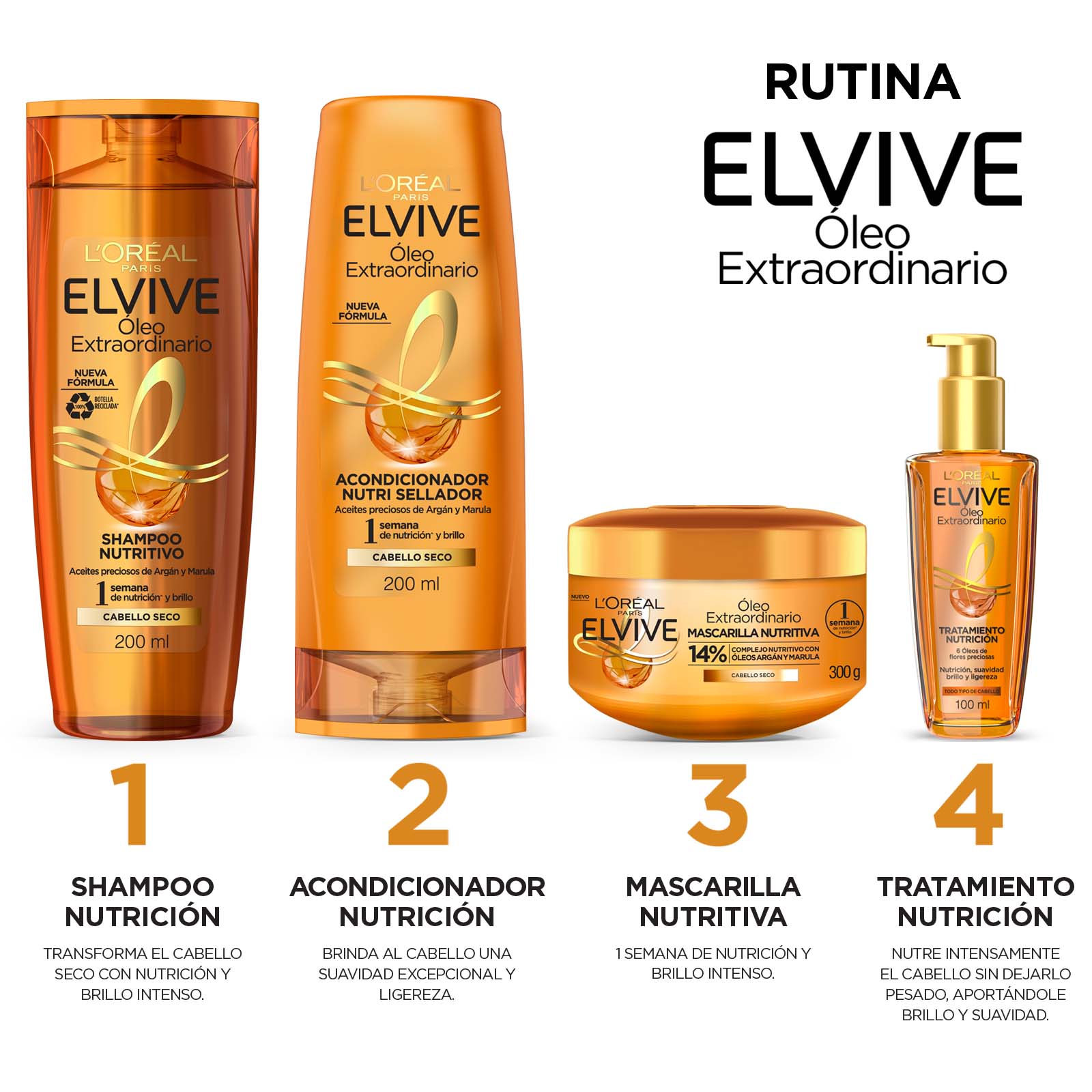 ¿Cabello seco? Tu cabello necesita una nutrición extraordinaria. Nuestro Acondicionador Nutrición, con 6 Óleos de Flores Preciosas y con efecto Anti-Sal°, transforma tu cabello de forma extraordinaria.. Elvive Óleo Extraordinario Nutrición Universal para todo tipo de cabellotiene como beneficio: 1. Nutrición y brillo intenso. 2. Excepcional suavidad y ligereza. Aplicar en puntas y largos sobre el cabello mojado después del shampoo ELVIVE NUTRICIÓN, dejar actuar y enjuagar. Para mejores resultados, utilizar los otros productos de la línea ELVIVE ÓLEO EXTRAORDINARIO. Evítese el contacto con los ojos. En caso de contacto con los ojos, enjuague inmediatamente. Manténgase fuera del alcance de los niños. Si observa alguna reacción desfavorable