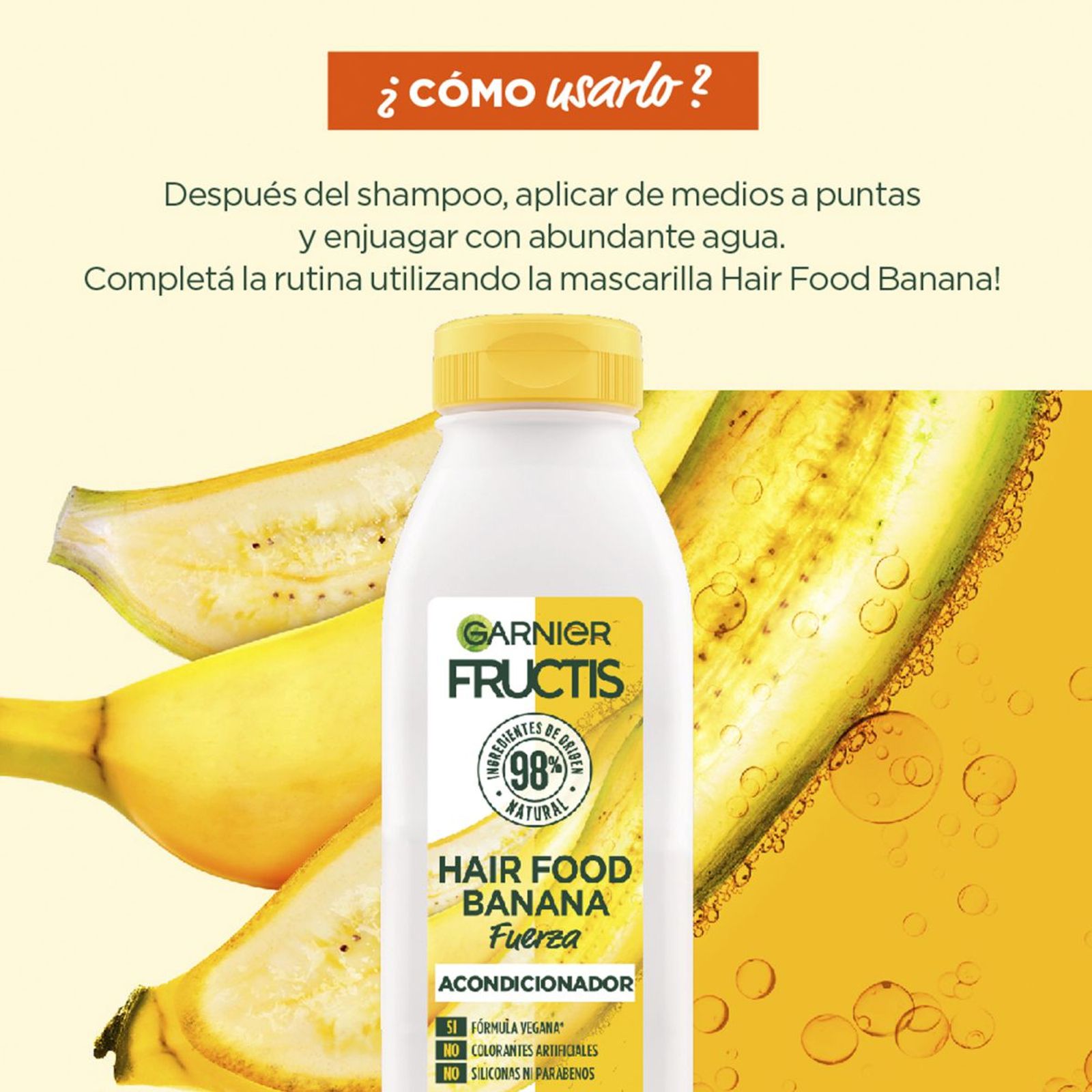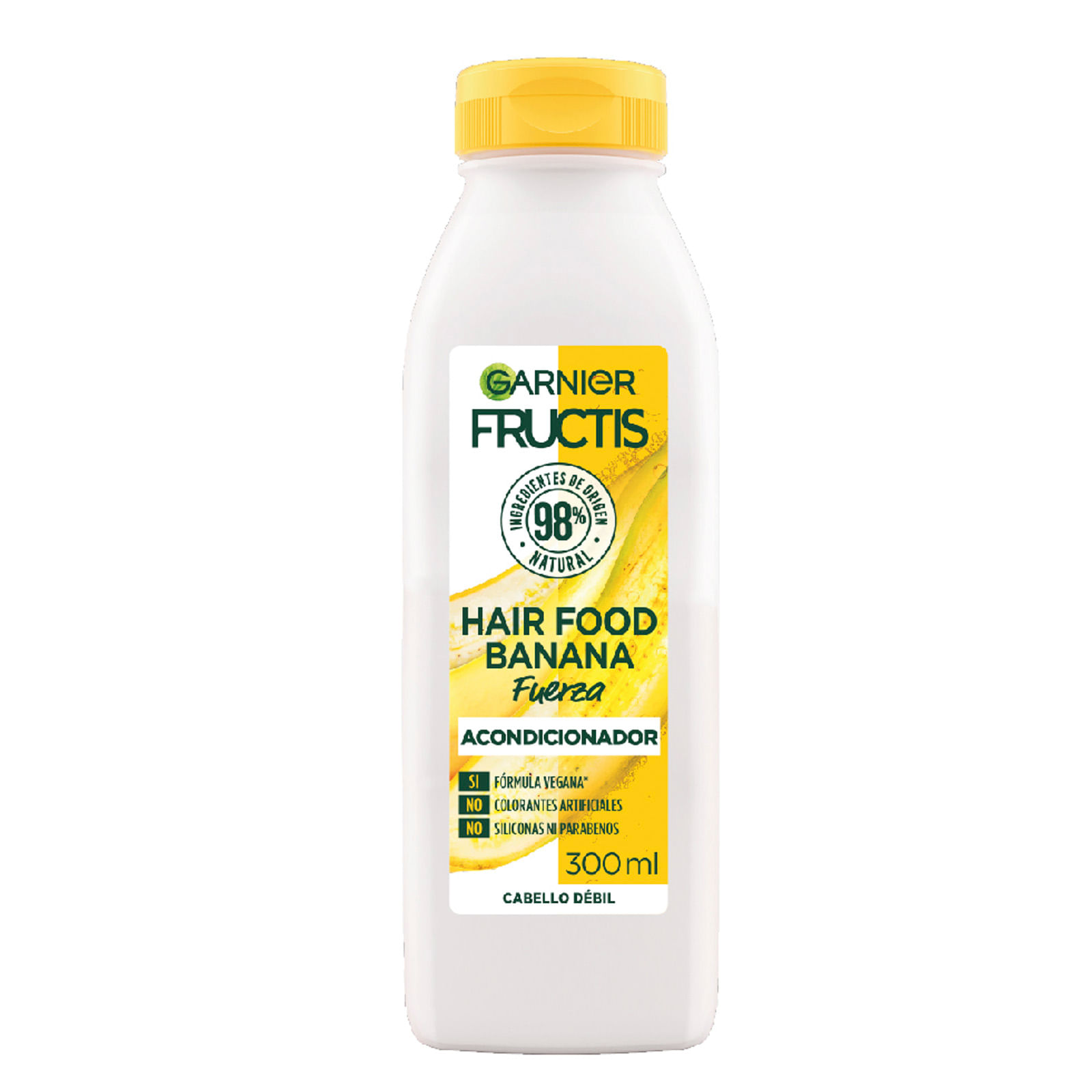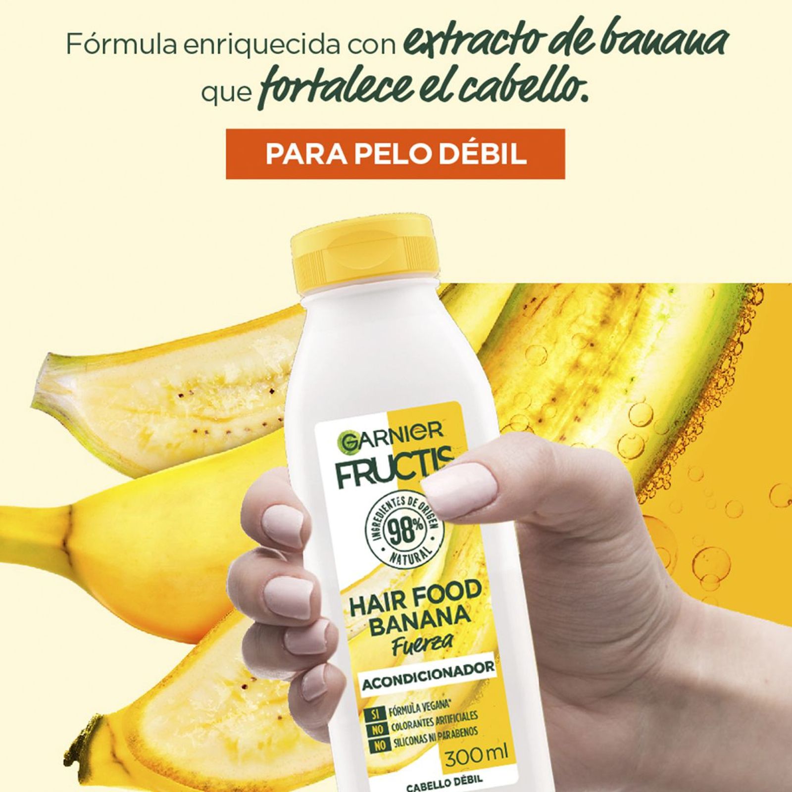 ¿Pelo débil? Fructis Hair Food Banana para darle fuerza a tu pelo. Este acondicionador tiene 98% de ingredientes de origen natural y fórmula vegana. No tiene siliconas, ni parabenos, ni colorantes artificiales. Además, es Cruelty Free.
