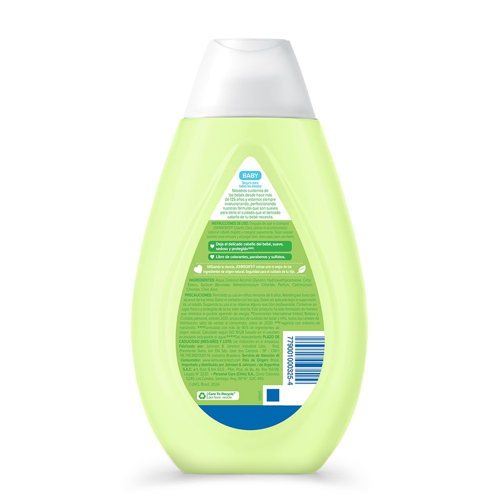 JOHNSON’S Marca #1 del mundo en cuidado de bebes y niños*. Nosotros cuidamos de los bebés desde hace más de 125 años y siempre estamos evolucionando, buscando perfeccionar nuestras fórmulas. Ahora son más suaves para brindar el cuidado que el cabello del bebé necesita. La línea JOHNSON’S Cabello Claro contiene manzanilla natural** que realza el color del cabello de tu bebé. Tiene pH fisiológico, es hipoalergénico y es libre de colorantes, parabenos, sulfatos e ftalatos. Los productos JOHNSON’S son desarrollados para cumplir con los más altos estándares de seguridad de ingredientes.