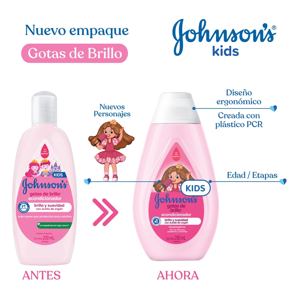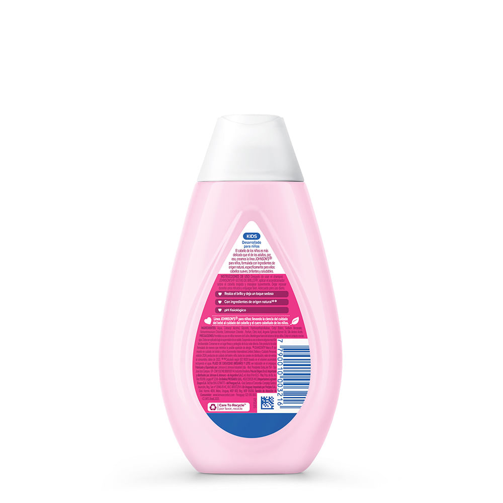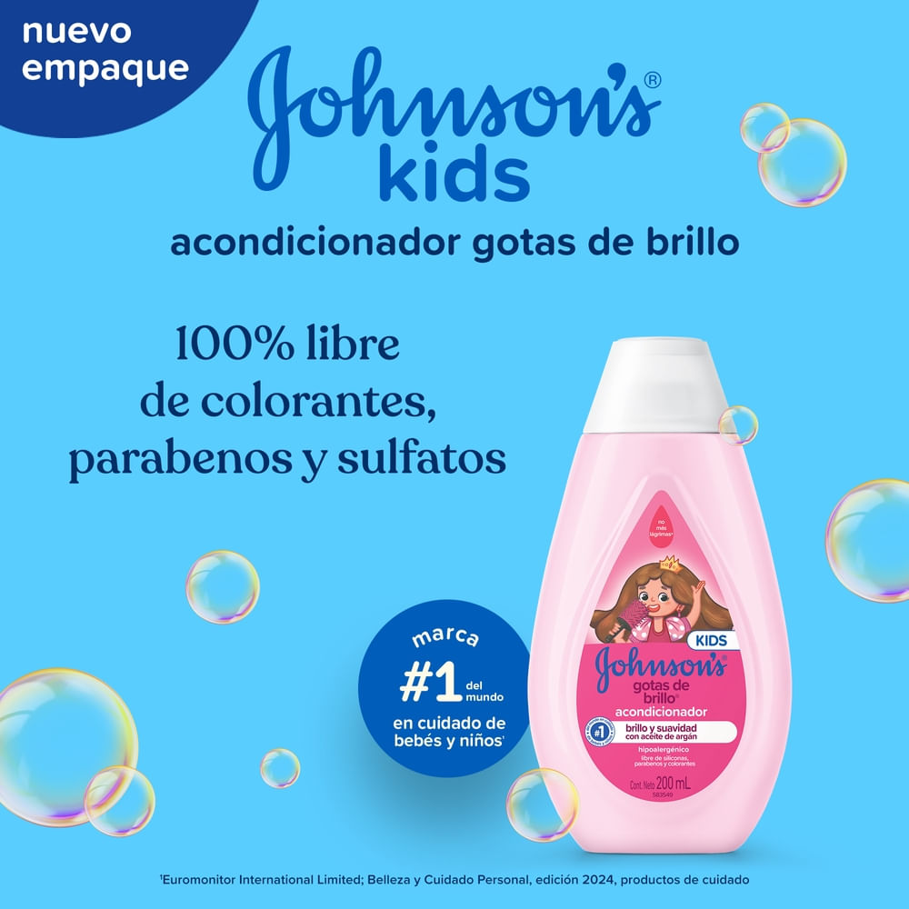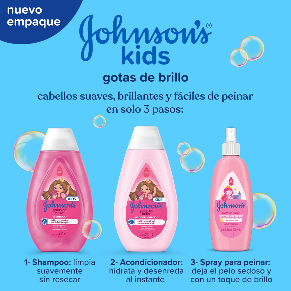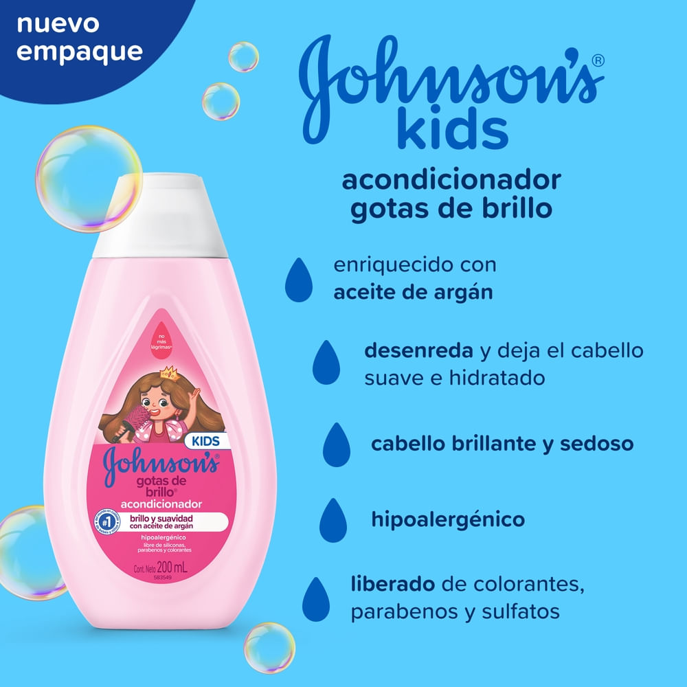 El Acondicionador JOHNSON’S Gotas de Brillo realza el brillo natural del cabello, dejándolo suave y con un toque sedoso. Su fórmula suave cuenta con aceite de argán y proteínas de seda. Tiene pH fisiológico, es hipoalergénico y es libre de colorantes, parabenos, sulfatos e ftalatos. Para cabellos aún más brillantes, suaves y sedosos, complemente con los productos restantes de la línea. Después del uso del shampoo, coloque el producto en las manos y, enseguida, masajee el cabello. Deje actuar por algunos instantes y a continuación enjuague. Debe ser aplicado por un adulto o bajo su supervisión. No aplicar en cuero cabelludo que presente irritaciones. Adecuado para uso diario.