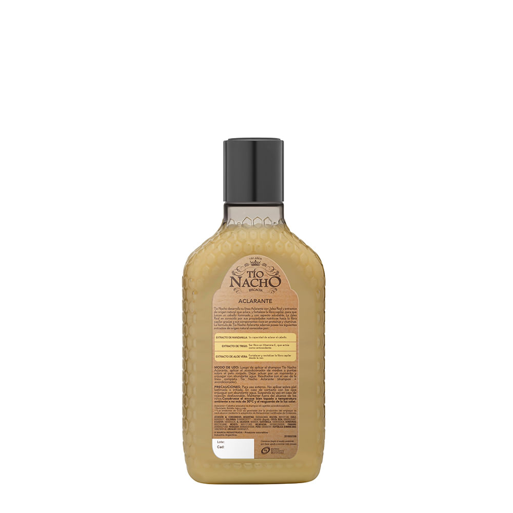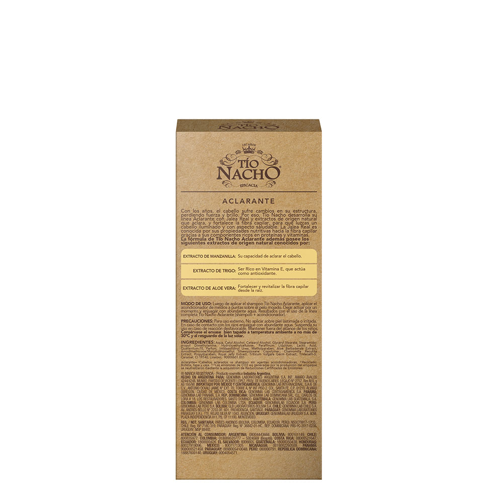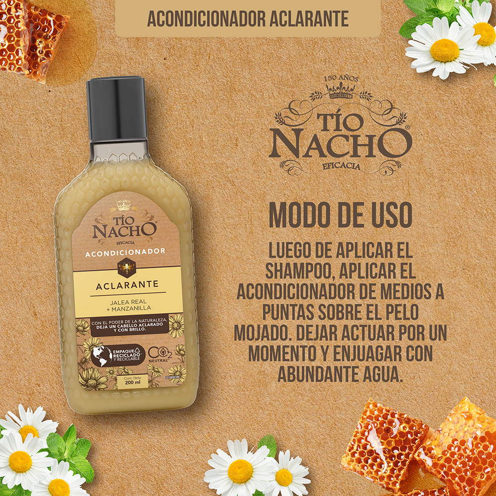 Acondicionador Tío Nacho Aclarante, con jalea real, manzanilla y extractos de origen natural.