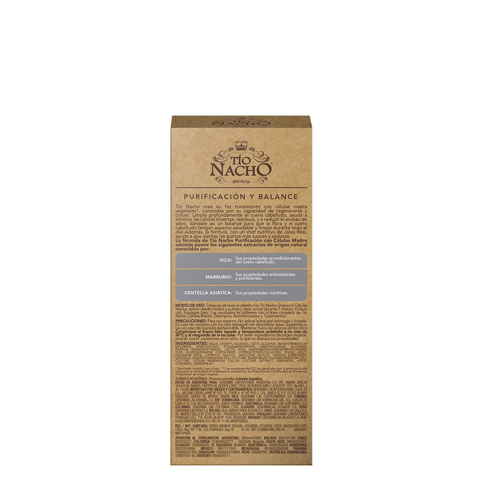 INNOVACIÓN: La primera línea con células madre vegetales REALMENTE NATURAL: Tío Nacho Acondicionador Purificación contiene es libre de colorantes, parabenos y oleos minerales.