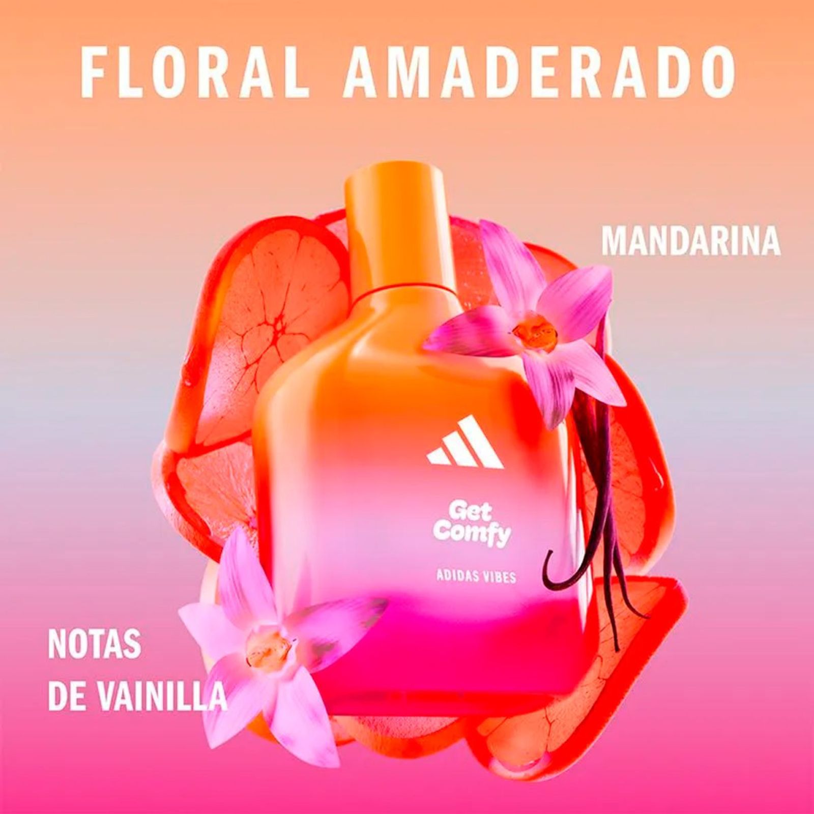 Fragancia Eau de Parfum Adidas Vibes Get Comfy Un Eau de Parfum relajante y reconfortante de larga duración que se ha demostrado que transmite energía positiva* (* 81 % de opiniones favorables en una prueba de consumo de 106 participantes). Con notas de vainilla y mandarina, con aceites naturales esenciales. Dermatológicamente testada y fórmula vegana Fabricado con materiales reciclados** (** 96 % de tapón PCR, 25 % de vidrio PCR, cartón FSC).