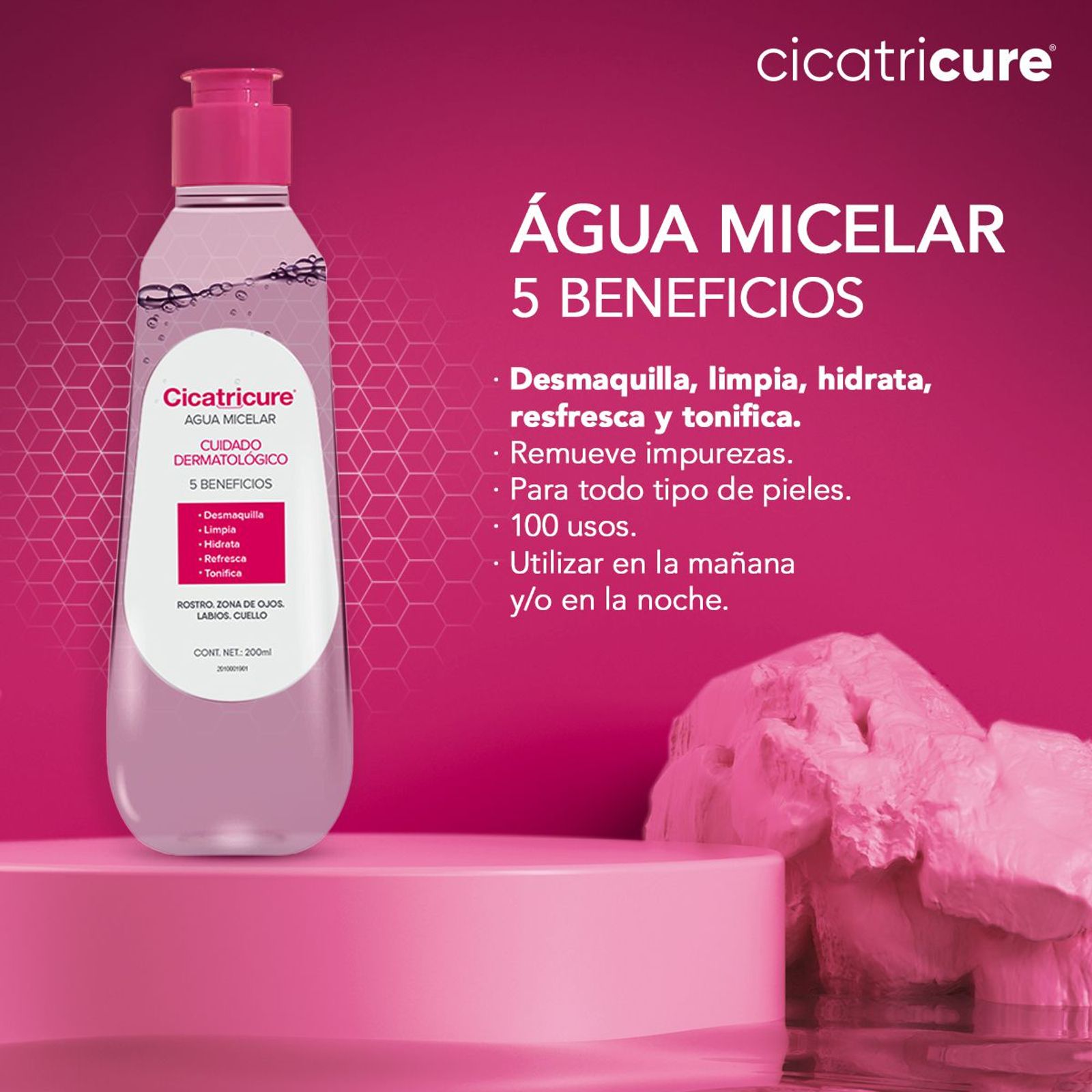 Cicatricure Agua Micelar es una efectiva tecnología en limpieza facial 5 en 1. Desmaquilla, limpia a profundidad, libera los poros, tonifica y refresca. En una sola pasada sus micelas actúan como imanes para capturar la suciedad, la grasitud y los rastros de maquillaje de la piel al instante. Desmaquilla incluso el maquillaje a prueba de agua, es apto para pieles sensibles, Hipoalergenico y sin Alcohol.
