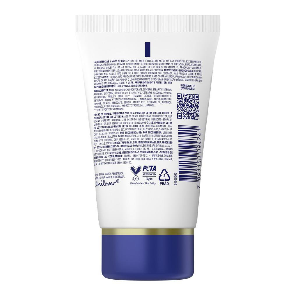 Dove Reparación Diaria 48h es un desodorante crema serum antitranspirante con aplicador anatómico y desarrollado con 1/4 de crema humectante + vitamina E, con la suave fragancia tradicional de Dove Original. Ideal para el cuidado de la delicada piel de las axilas ofrece hasta 48 horas de protección contra el sudor y el mal olor, y ayuda a reparar la piel de la irritación causada por el afeitado . El resultado: una piel más suave y tersa, todos los días.