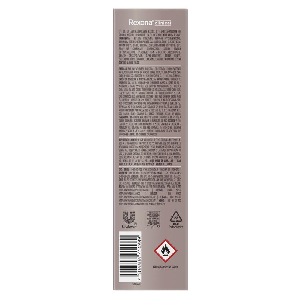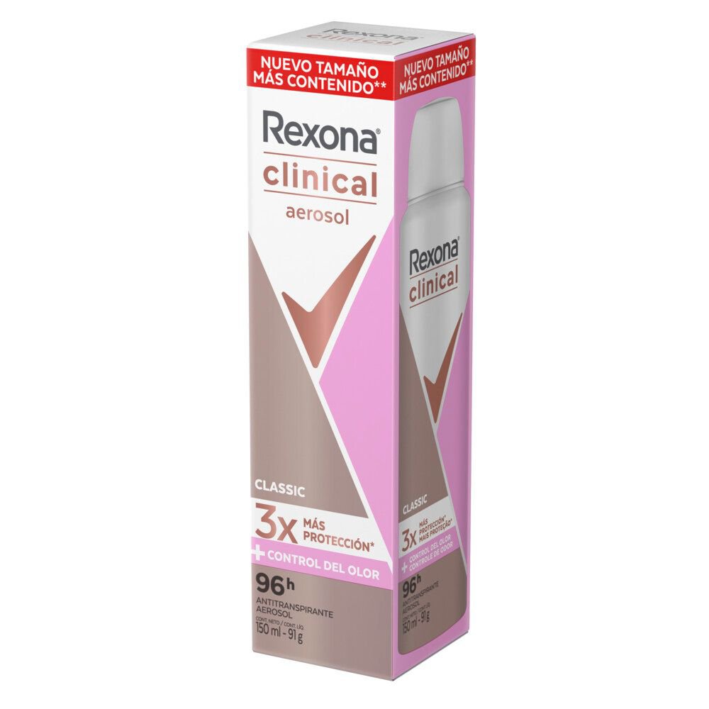 El desodorante antitranspirante Rexona Clinical Women en aerosol, brinda 3 veces mayor protección contra el sudor que un antitranspirante común. Su exclusiva tecnología forma un micro escudo de protección que dura por 96 horas. Está especialmente diseñado para aquellas personas que necesitan máxima protección contra la transpiración y el mal olor. Posee una exclusiva combinación de ingredientes que forma una barrera contra el sudor mucho más potente que un antitranspirante común, y por eso es más efectiva. Además, posee protección extra contra el mal olor activada por el movimiento, gracias a la tecnología MotionSense. Especialmente formulado para ofrecerte una máxima protección cuando más la necesitas, lo cual, algunas veces, es todos los días. Este antitranspirante con fuerza Clínical crea una barrera impenetrable contra la transpiración para una sensación extremadamente limpia, sin importar lo que suceda. Nosotros te protegemos totalmente.