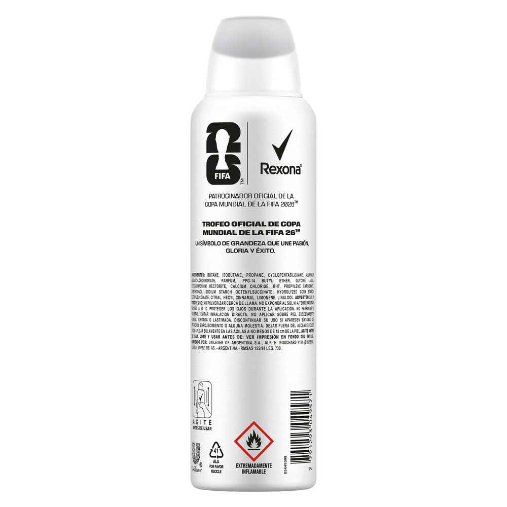 Con su presentación en aerosol de 150 ml, tendrás la cantidad perfecta para llevar en tu bolso deportivo o para usar en tu rutina diaria. No permitas que el sudor arruine tu pasión por el fútbol, confía en el Antitranspirante Rexona Women Copa del Mundo de la FIFA 2026™ en Aerosol 150 ml y marca el ritmo en la cancha con una protección imbatible. ¡Únete al equipo Rexona y demuestra que eres una verdadera fanática del fútbol!
