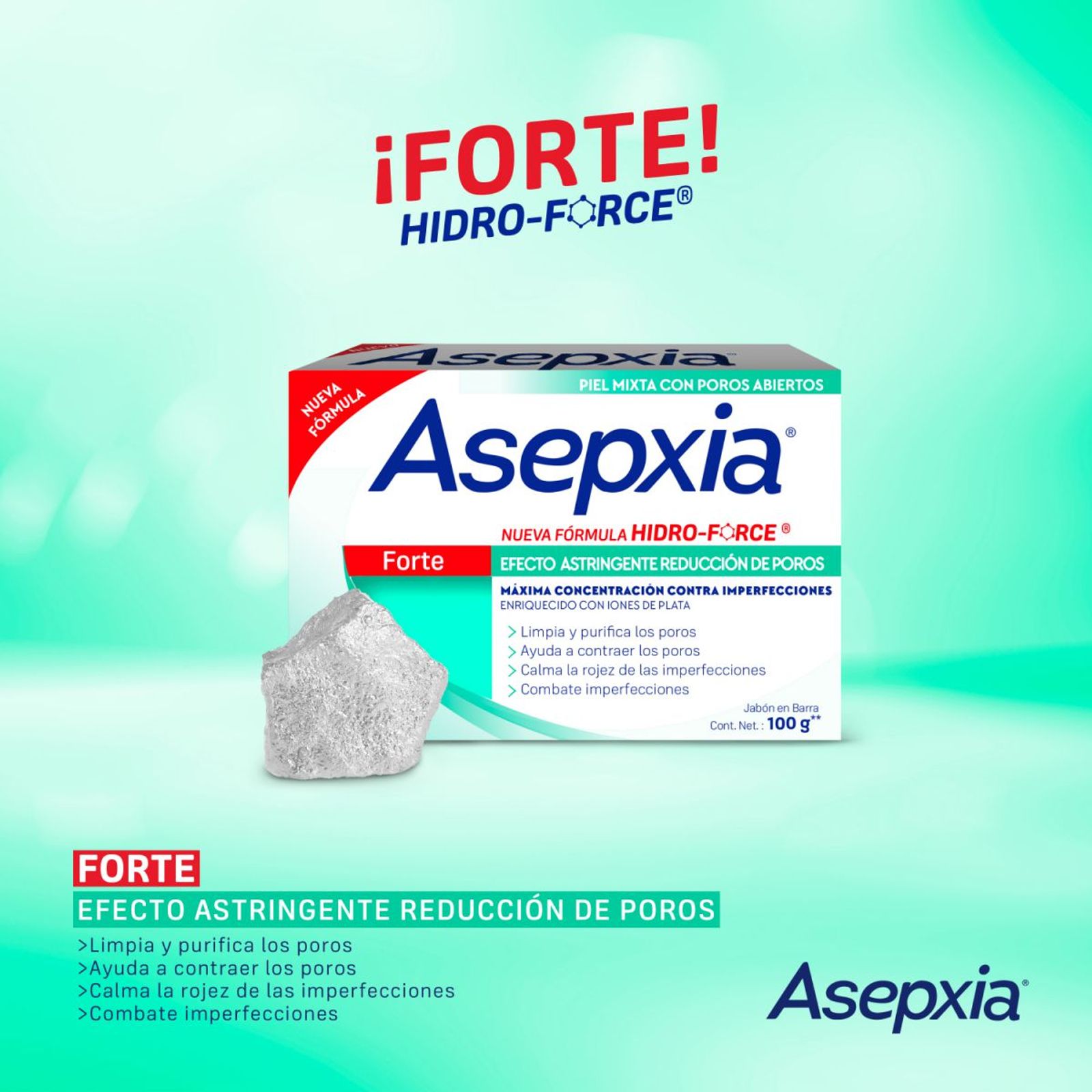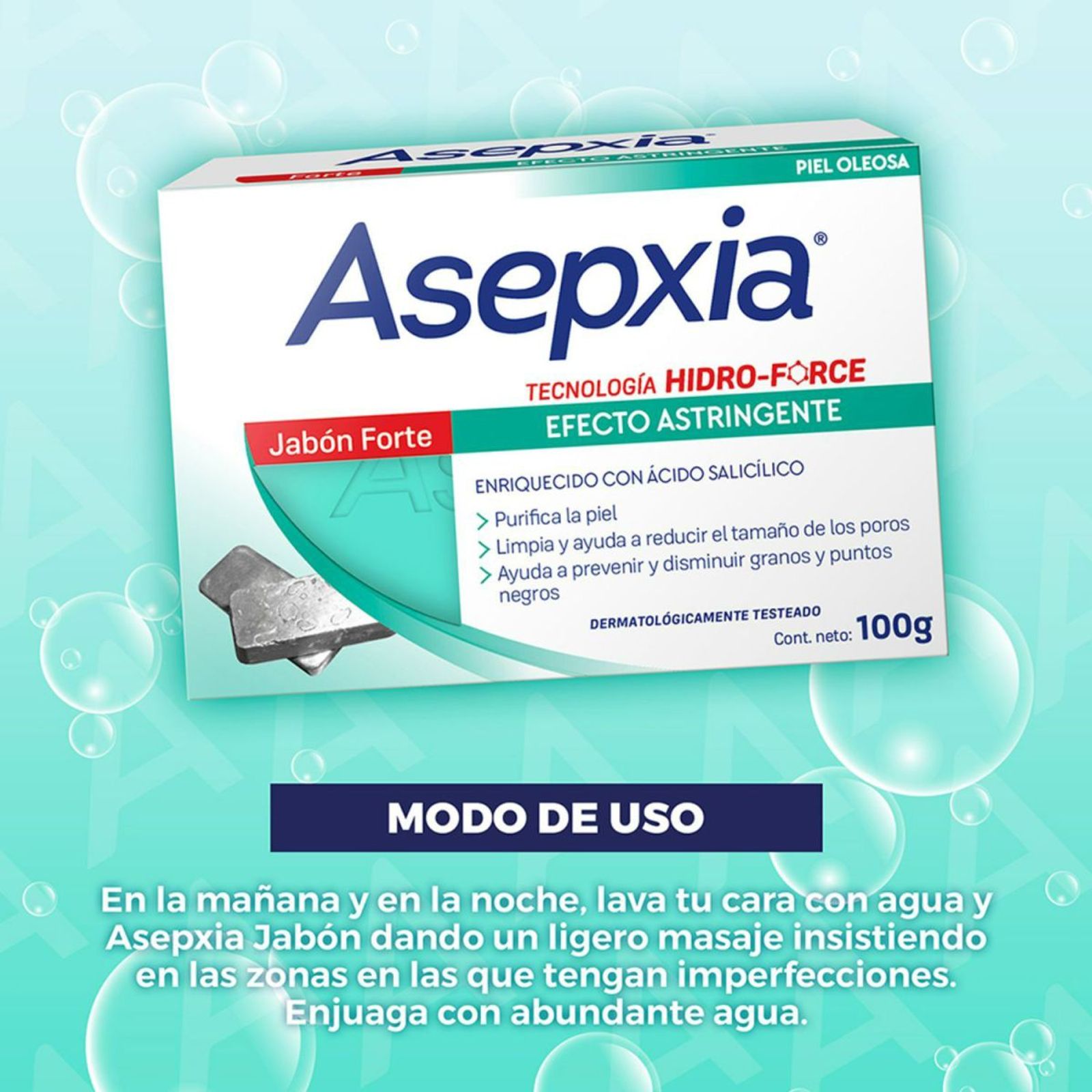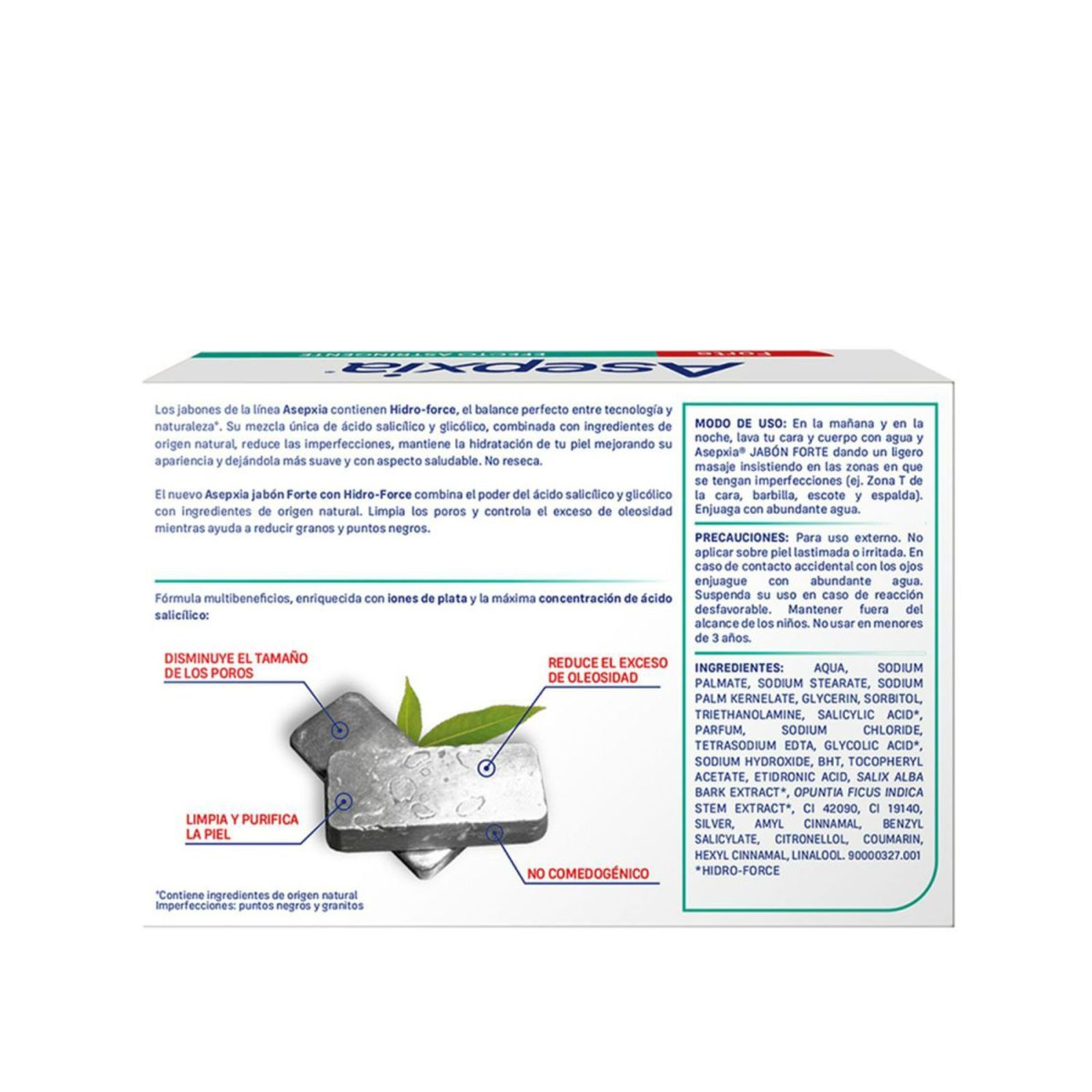 Jabón Asepxia en barra con efecto reductor de poros, su nueva fórmula hidro-force presenta una mezcla única de ácido salicílico y glicólico combinado con extractos de ingredientes naturales. BENEFICIOS – FÓRMULA HIDRO FORCE: Jabón en barra con efecto reductor de poros, su nueva fórmula hidro-force presenta una mezcla única de ácido salicílico y glicólico combinado con extractos de ingredientes naturales. – EFECTO REDUCTOR DE POROS: Recomendado para piel mixta, sus ingredientes contraen los poros cerrándolos a la vez que ayudan a prevenir y combatir imperfecciones. – INGREDIENTES ACTIVOS: Agua, glicerina, palmato de sodio, alcohol, ácido salicílico, entre otros. – EXCESO DE GRASA SIN RESECAR LA PIEL: Disminuye el exceso de grasa y calma la rojez e irritación sin resecar la piel. MODO DE USO: En la mañana y en la noche, lava tu cara con agua y Asepxia Jabón Forte dando un ligero masaje, insistiendo en las zonas más afectadas. Enjuaga con abundante agua.