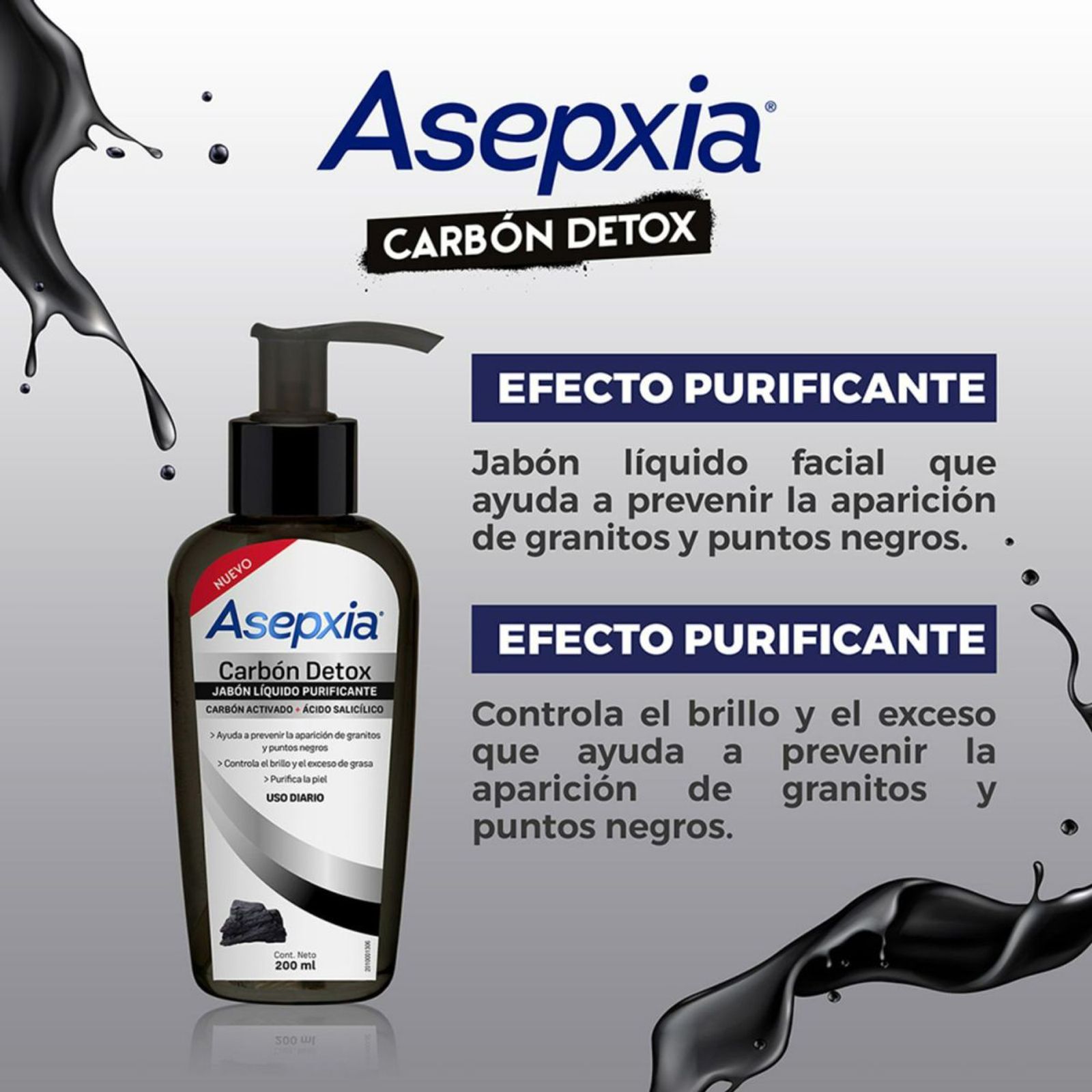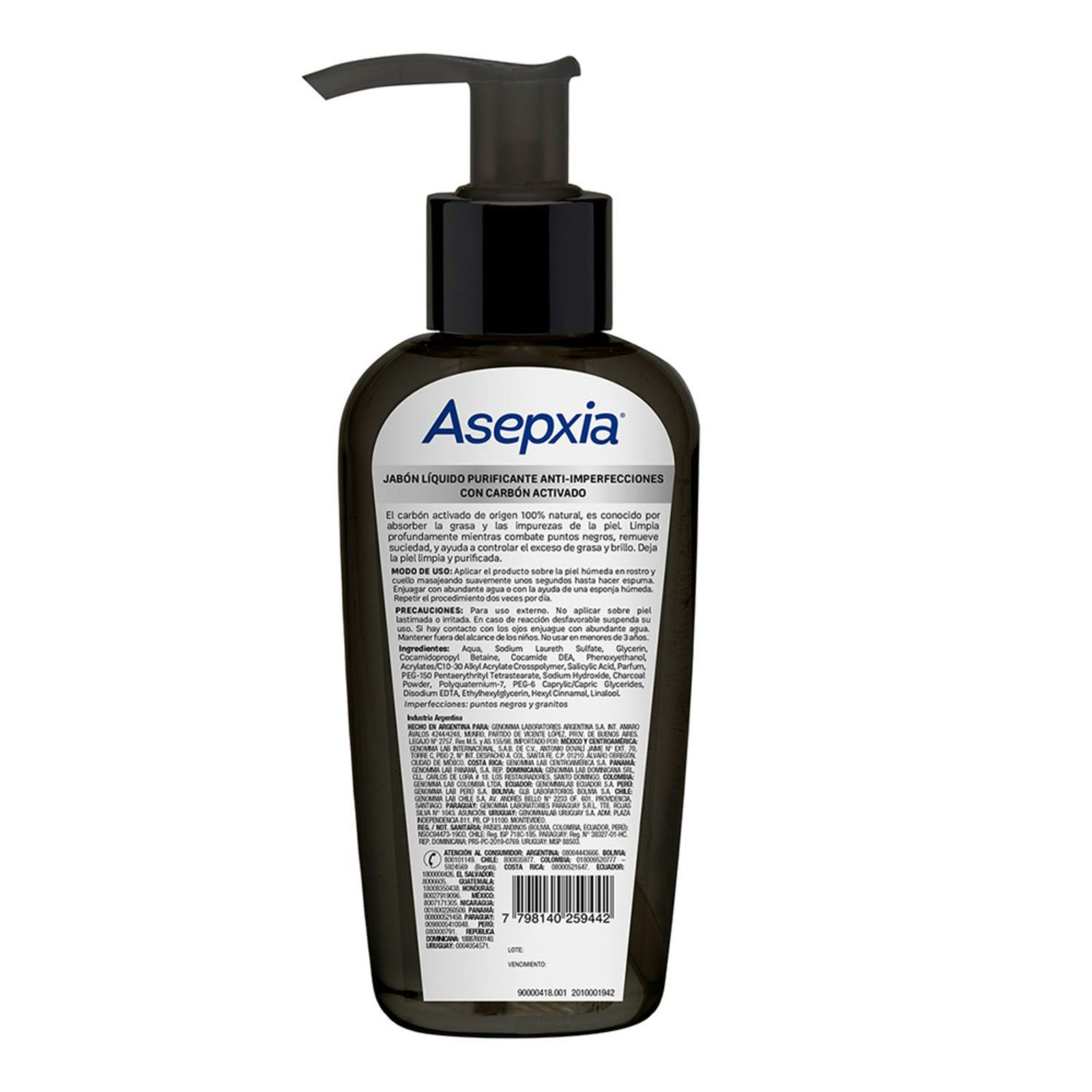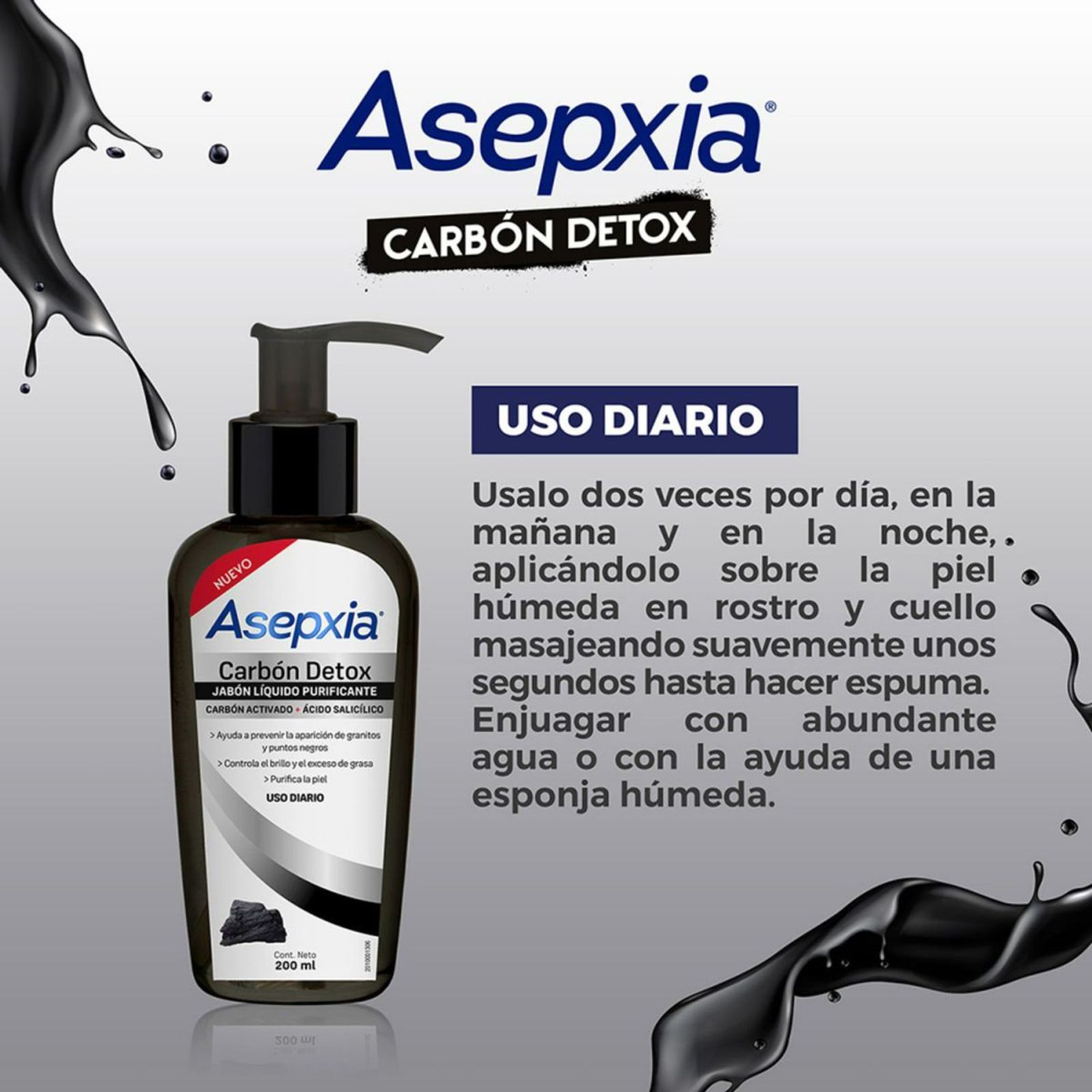El Jabón Líquido Facial carbón detox de Asepxia limpia profundamente, purifica la piel, controla el brillo y el exceso de grasa. BENEFICIOS – EFECTO PURIFICANTE: Jabón líquido facial que ayuda a prevenir la aparición de granitos y puntos negros. – BRILLO: Controla el brillo y el exceso de grasa, purificando la piel. – carbón detox: Carbón Activado + Ácido Salicílico. – LIMPIEZA PURIFICANTE: El jabón líquido facial carbón detox de Asepxia es un nuevo concepto en limpieza para todas edades y,especialmente, pieles mixtas o grasas con imperfecciones, gracias a su formulación con carbón activado y ácido salicílico. MODO DE USO: USO DIARIO Usalo dos veces por día, en la mañana y en la noche, aplicándolo sobre la piel húmeda en rostro y cuello masajeando suavemente unos segundos hasta hacer espuma. Enjuagar con abundante agua o con la ayuda de una esponja húmeda.