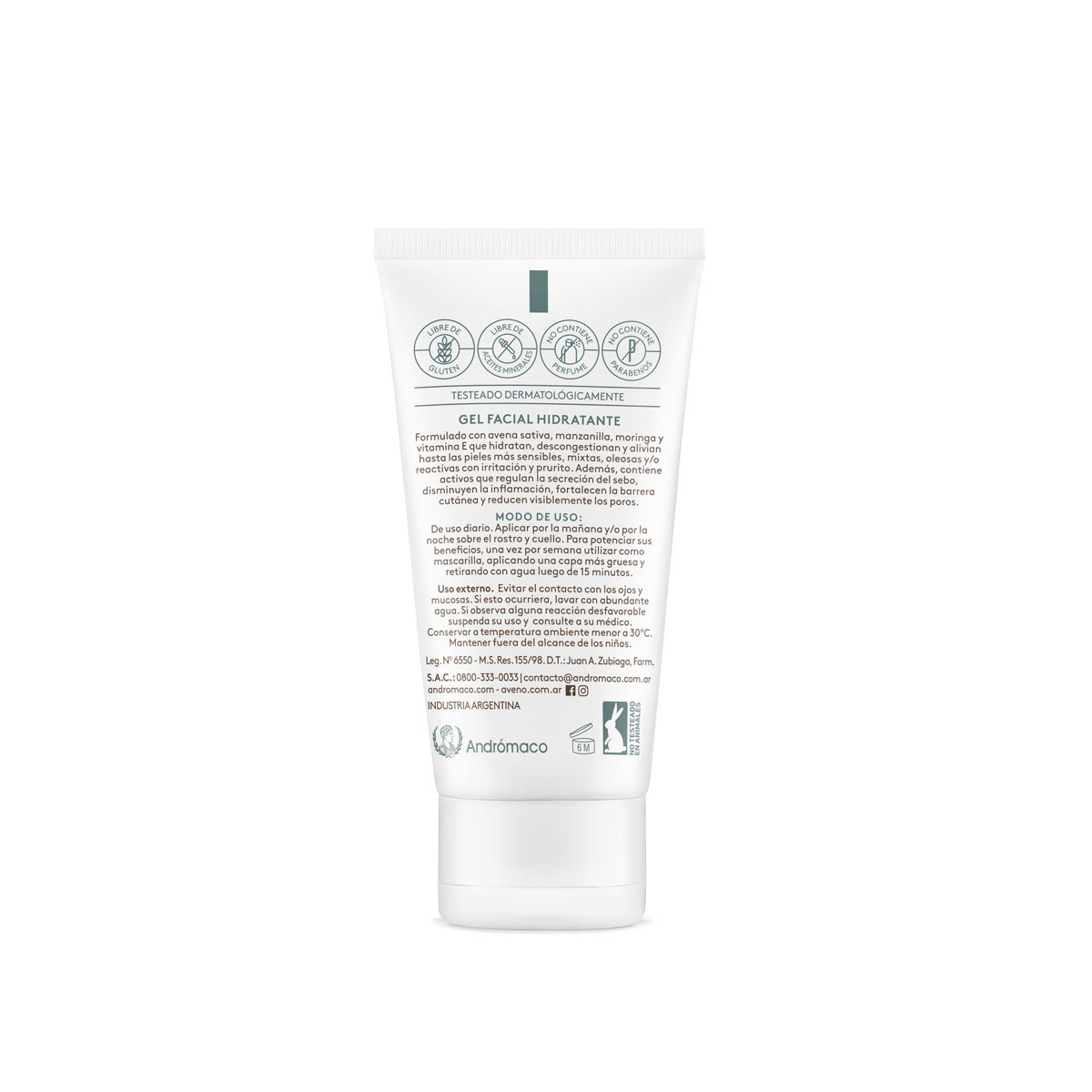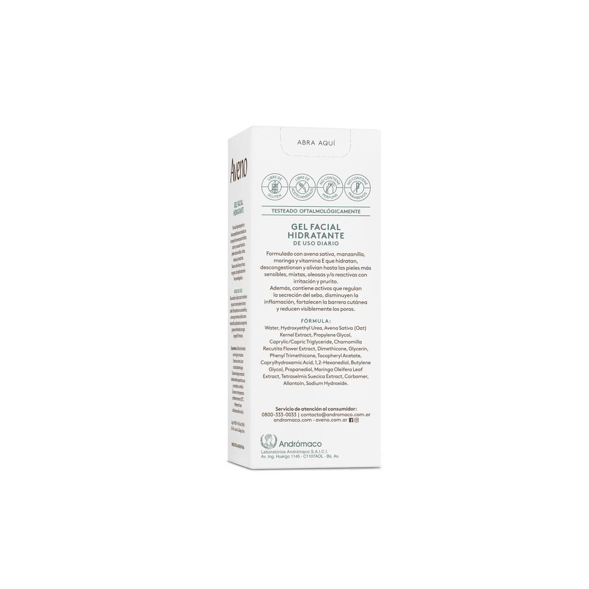 El gel facial Aveno hidrata, descongestiona y alivia las pieles mixtas, oleosas y sensibles. Puede ser utilizada en pieles reactivas con irritación y prurito. Posee algas marinas que actúan como sebo regulador, manzanilla que descongestiona y vitamina E como antioxidante. Ayuda a descongestionar y calmar la irritación de la piel. Gracias a la alantoína de su fórmula, posee propiedades antiirritantes e hidratantes. Puede utilizarse solo o en combinación con otros tratamientos dermatológicos o cosméticos. Puede ser utilizada de día y de noche.