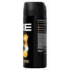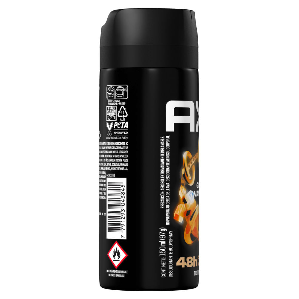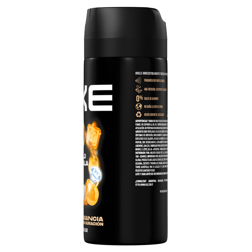 AXE Gold es un desodorante para hombre corporal que tiene una fragancia oriental con sutil aroma amaderado y con notas de mandarina, pimienta negra y sensual vainilla. El chocolate fundido se mezcla con cítricos frescos y maderas para obtener un aroma masculino oscuramente dulce. Preparate para las aventuras. De todo tipo. Nunca sabés lo que hay a la vuelta de la esquina. O quién. Por eso necesitás un desodorante en aerosol que te mantenga oliendo como un ganador todo el día, todos los días. Nuestra nueva y revolucionaria tecnología de doble acción combate las bacterias que causan el mal olor para que puedas oler increíble durante 48 horas. Sentí vos también el efecto AXE. Porque oler increíble vale oro, tenés que tener siempre a mano el desodorante AXE Gold. No importa lo que se te presente: vos estás listo. Una aplicación rápida en toooodo el cuerpo te mantiene con un olorcito ganador e irresistible durante 48 horas. Agitá, girá la parte de arriba para abrir la tapa y rociá el producto por todo el cuerpo. Mantené el envase del desodorante en aerosol a 15 centímetros y evitá las partes íntimas. Sentí el dulzor de esta fragancia con olorcito ganador y compartilo con el mundo. Todo el día, toda la noche, pase lo que pase, estás listo para ir por el oro. El mismo aroma de AXE Gold en el que siempre confiaste, ahora en lata renovada hecha de aluminio infinitamente reciclable. Más fresco estás vos, más limpio está el planeta. En AXE nos propusimos que para 2025 todos nuestros envases sean reciclables o incluyan materiales reciclados. La fórmula de los desodorantes en aerosol AXE tienen 0% sales de aluminio y no dañan la capa de ozono. Bienvenido al futuro… huele increíble.