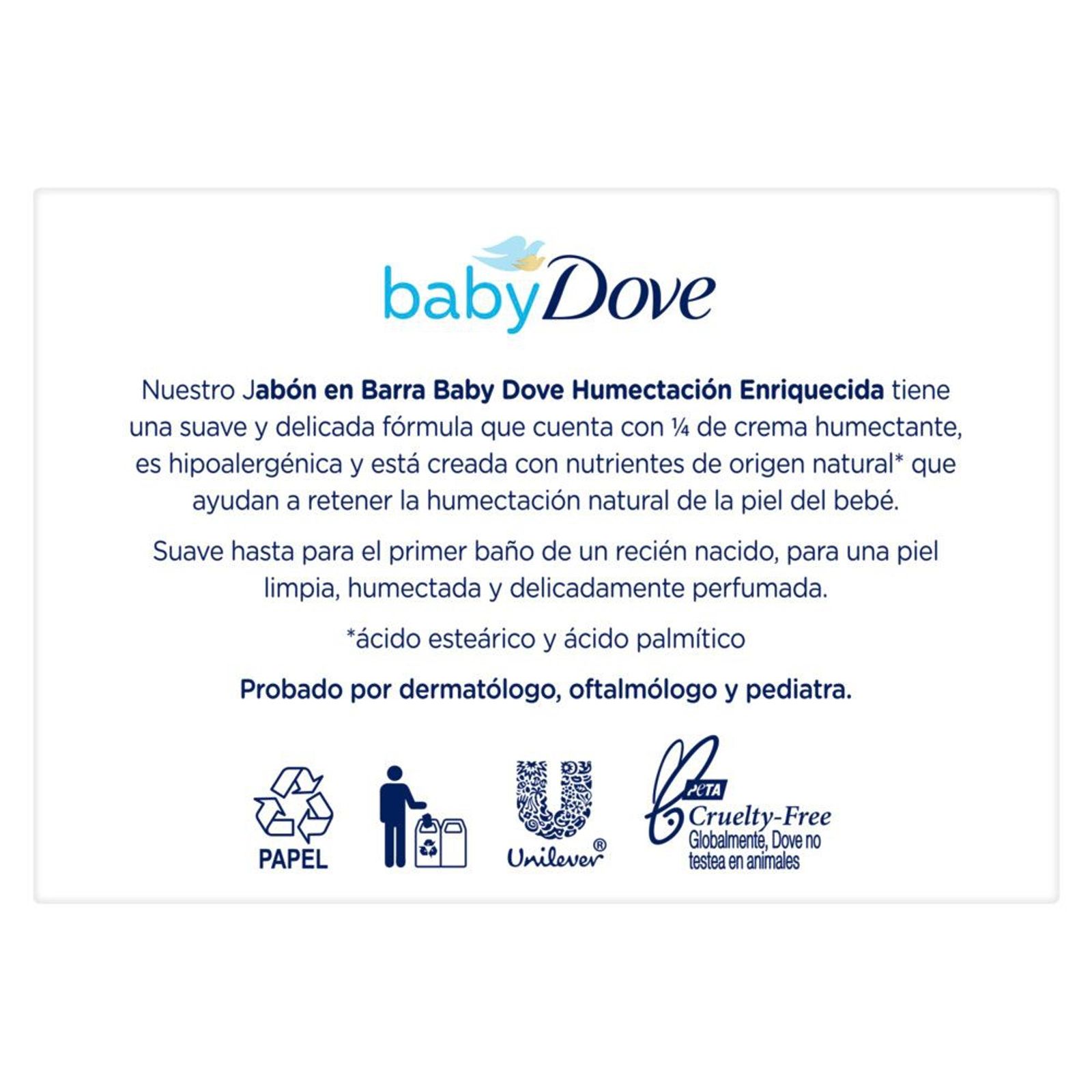 Protege delicadamente la piel de tu bebé con el jabón en barra Baby Dove, desarrollado exclusivamente para el cuidado de su piel. La piel del bebé es un 30% más delgada que la de un adulto, de modo que no es una sorpresa que sea más vulnerable al daño y la sequedad. Su barrera cutánea es más débil también, lo que hace que la piel pierda humectación hasta cinco veces más rápido que la de un adulto. A diferencia de los jabones regulares para bebé**, el jabón en barra Hipoalergénico Humectación Enriquecida está enriquecido con ¼ de crema humectante y pH neutro que ayuda a proteger la piel del bebé frente al resecamiento y posibles irritaciones. Además, tiene una fragancia que ha sido desarrollada especialmente para piel del bebé. Hecho con nutrientes esenciales de origen natural que ayudan a proteger la barrera de la piel de tu bebé y a mantener la humectación. El jabón hipoalergénico fue testeado por oftalmólogos, dermatólogos y pediatras. Con el jabón en barra Baby Dove Humectación Enriquecida podés disfrutar del especial momento del baño con tu bebé y asegurarte de que su piel recibirá el cuidado que se merece. *ácido esteárico y ácido palmítico *Jabones en barra comunes sin nutrientes esenciales de la piel.