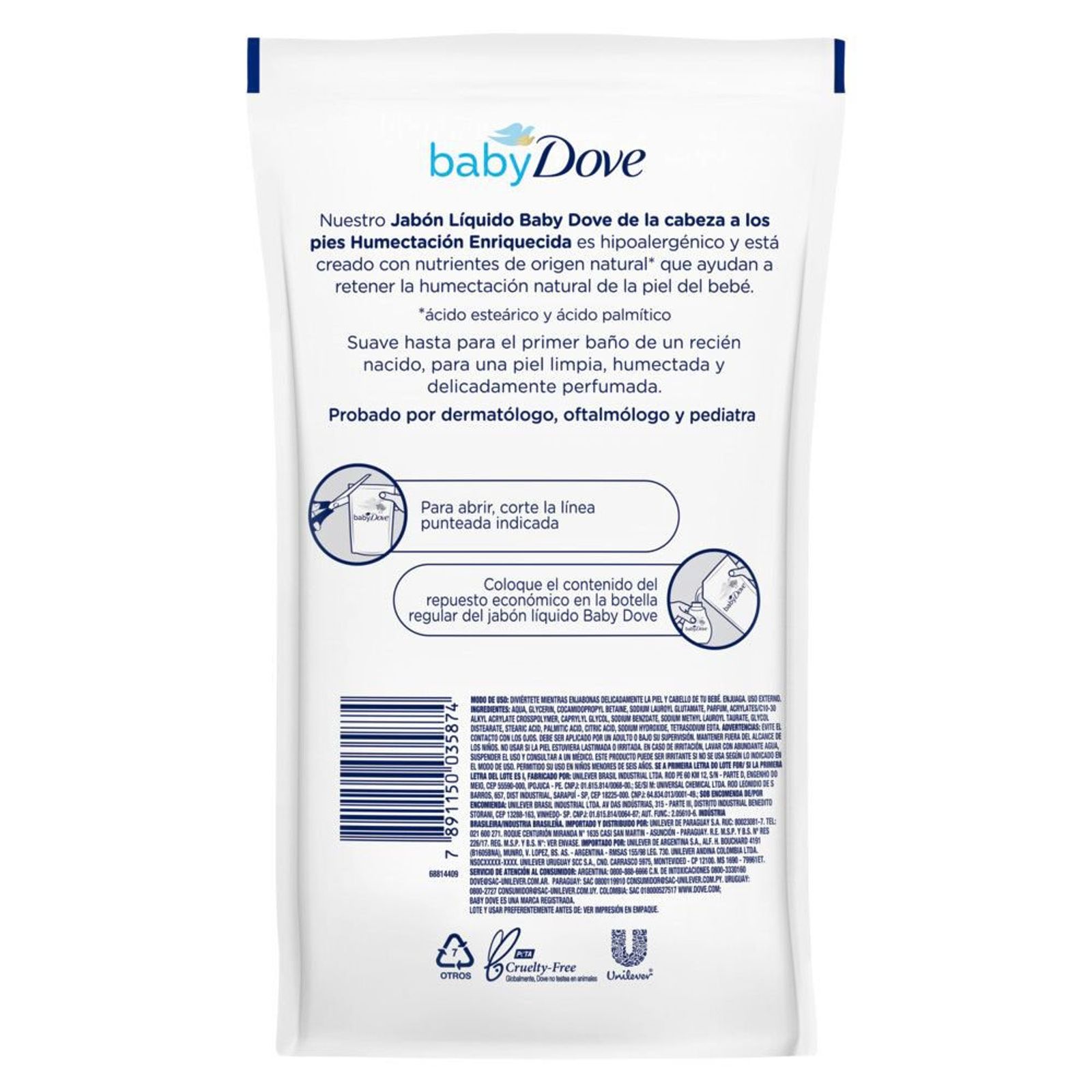 Un jabón líquido de la cabeza a los pies, sin lágrimas que ayuda a hidratar la delicada piel de tu bebé manteniéndola suave todo el día. Debido a que la piel del bebé puede ser un 30% más delgada que la de un adulto, es necesario asegurar un delicado cuidado. Para ayudar a proteger la piel de tu bebé, creamos el jabón líquido Baby Dove Humectación Enriquecida Refill. No sólo es ideal para asegurar una delicada limpieza sino que ayuda a reponer los nutrientes esenciales de la piel del bebé que se pierden durante el baño.