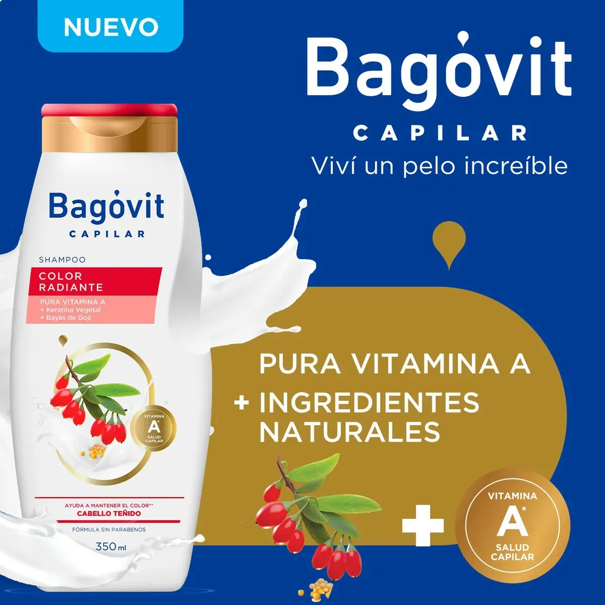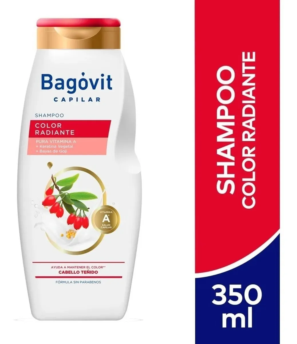 El Shampoo Color Radiante Bagóvit contiene Pura Vitamina A, combinada con Keratina Vegetal, que ayuda a sellar las fibras capilares y a controlar el encrespamiento del cabello. Además, su fórmula con Bayas de Goji, reactiva la belleza del pelo dañado, aumentando su espesor y suavidad. Genera un sellado duradero, manteniendo los colorantes en la fibra. El resultado es un color protegido y de mayor duración hasta por 45 lavados. Prolonga el brillo, la suavidad y la nutrición.
