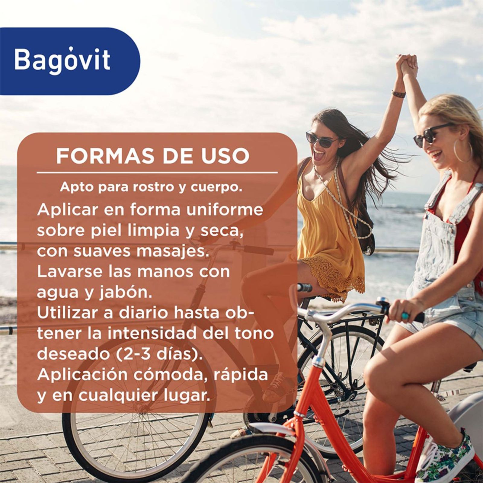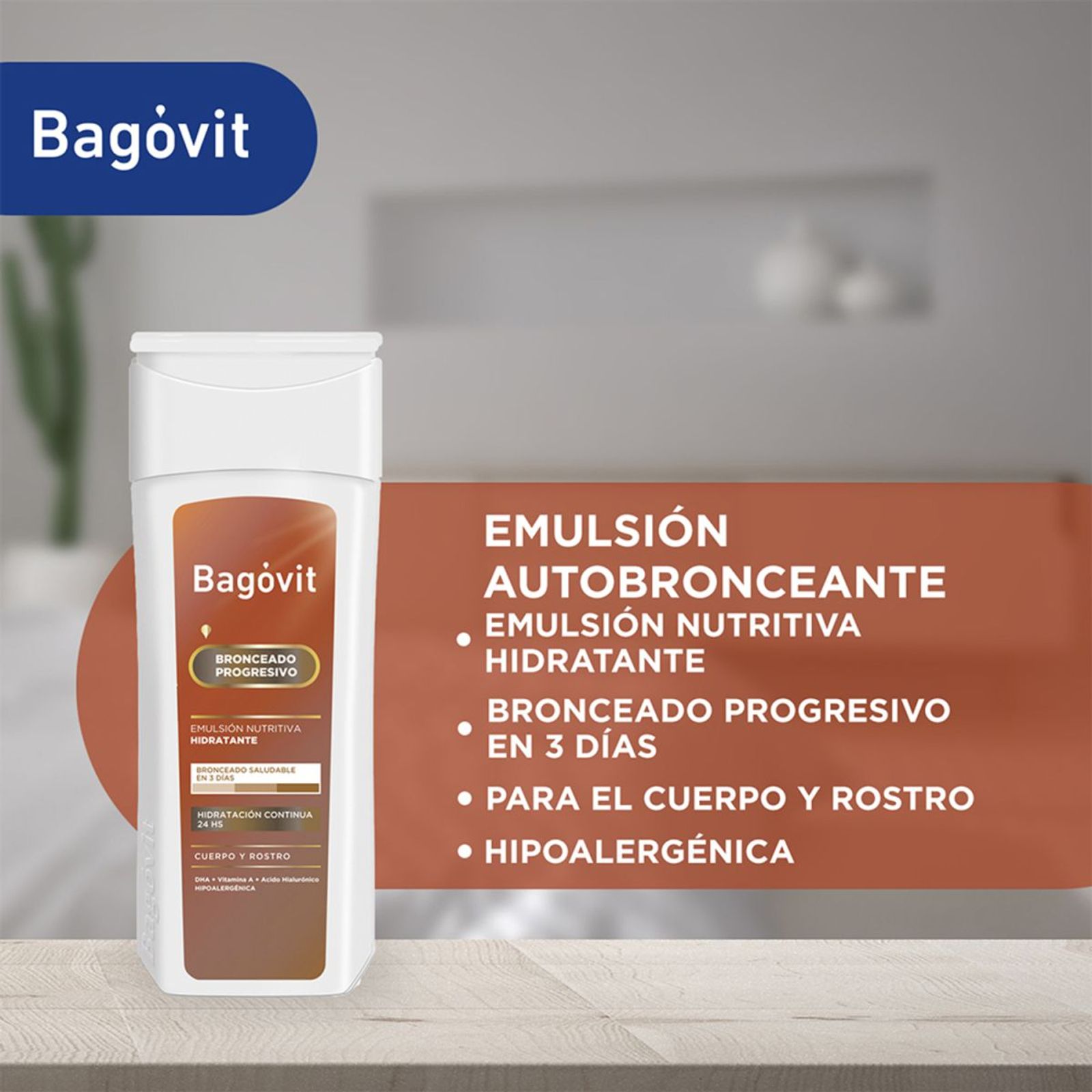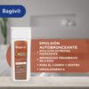 La Emulsión Hidratante Autobronceante Bagóvit A contiene una fórmula enriquecida con Ácido Hialurónico y Vitaminas A y E, que hidratan y nutren tu piel mientras le brindan un tono de bronceado saludable en cualquier momento del año. En tan solo 3 días obtendrás el color ideal de verano sin haber estado expuesta al sol. El Ácido Hialurónico actúa como una “esponja molecular” que retiene el agua brindándole a la piel hidratación continua. Además, estimula la circulación de agua entre las capas de la piel revitalizando y otorgándole suavidad y turgencia. Gracias a la Vitamina A, la piel incrementa la producción de colágeno e induce la síntesis de compuestos responsables de retener agua en la piel. Su acción reparadora restablece la elasticidad junto con la luminosidad y suavidad. Disminuye las arrugas producidas por el paso del tiempo y por el fotoenvejecimiento. Su fórmula enriquecida con Vitamina E también ayuda a proteger la membrana celular de los radicales libres y contribuye a su eliminación. Es una vitamina muy importante para la salud de la piel. Es hipoalergénica.