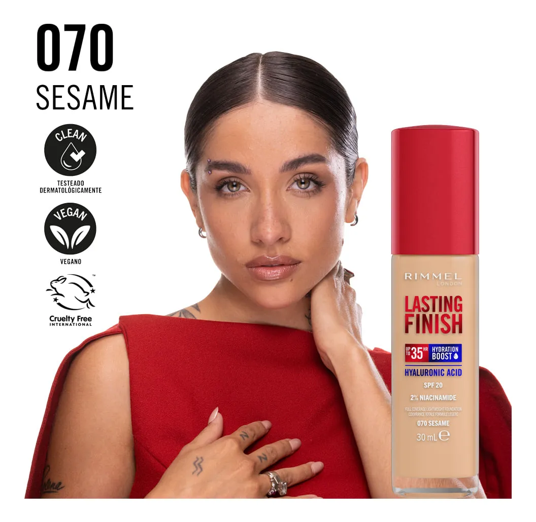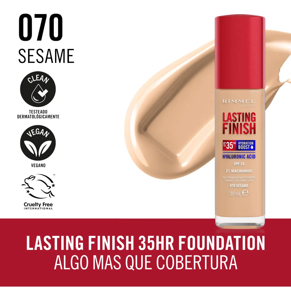 ¡Maquillaje y skin care en un solo producto! Consigue una hidratación insuperable y una duración de hasta 35 horas con Rimmel London Lasting Finish 35HS, la base de maquillaje de larga duración más hidratante de Rimmel. Una base de maquillaje vegana de cobertura completa con un acabado natural. Esta formulada con ácido hialurónico, vitamina E y un 2% de niacinamida para una hidratación insuperable. Está clínicamente probado e mejora la luminosidad de la piel. Contiene SPF20 para proteger la piel del sol, también protege la barrera de la piel de la contaminación y luz azul.