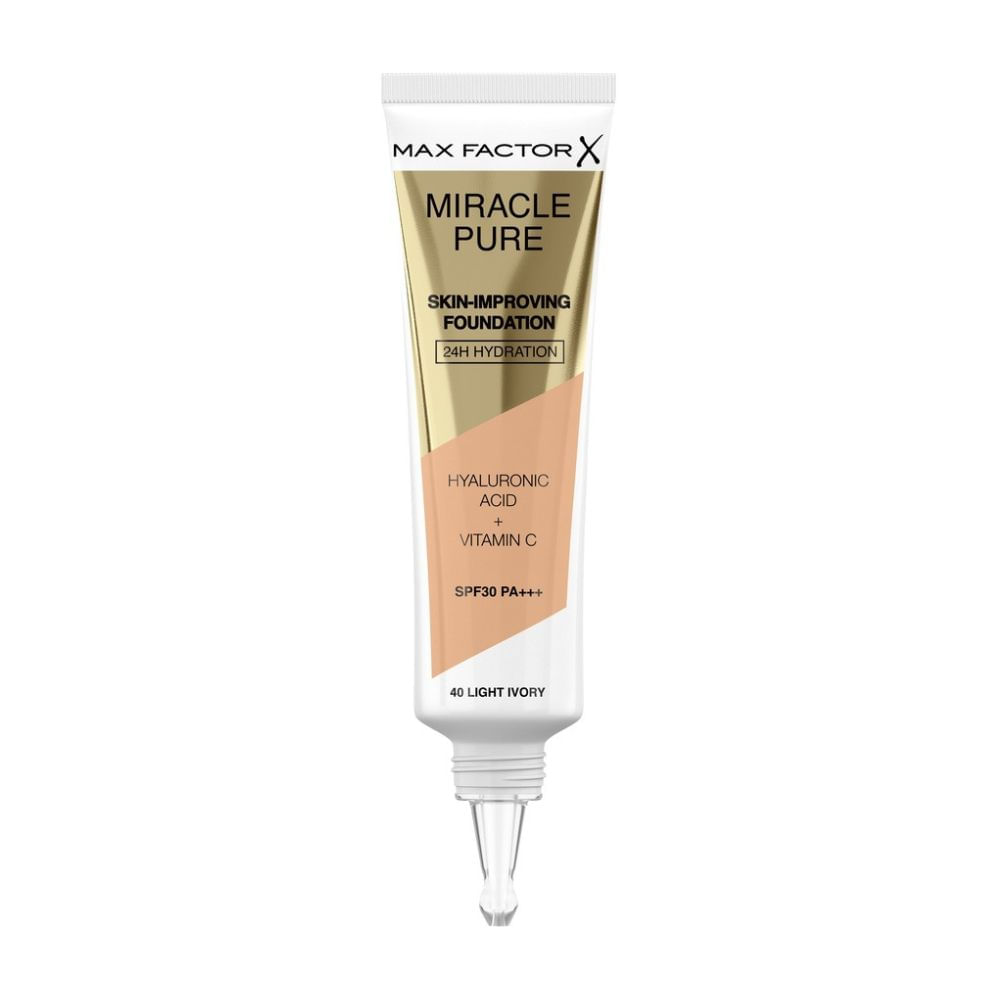 La nueva base Miracle Pure de Max Factor está clínicamente probada para cuidar la piel. En sólo un minuto y con una sola gota la revitaliza, haciendo que tu cutis se beneficie de cinco maneras: mayor luminosidad, firmeza, elasticidad, densidad y flexibilidad. Su avanzada fórmula contiene 89% de ingredientes para el cuidado de la piel, como el complejo potenciador del colágeno, la vitamina C y el ácido hialurónico. Se ha demostrado clínicamente que proporciona 24 horas de hidratación, lo que permite rellenar y mejorar la firmeza y elasticidad de la piel día a día. Además contiene SPF30PA+++ UVA/UVB y está dermatológicamente probada.
