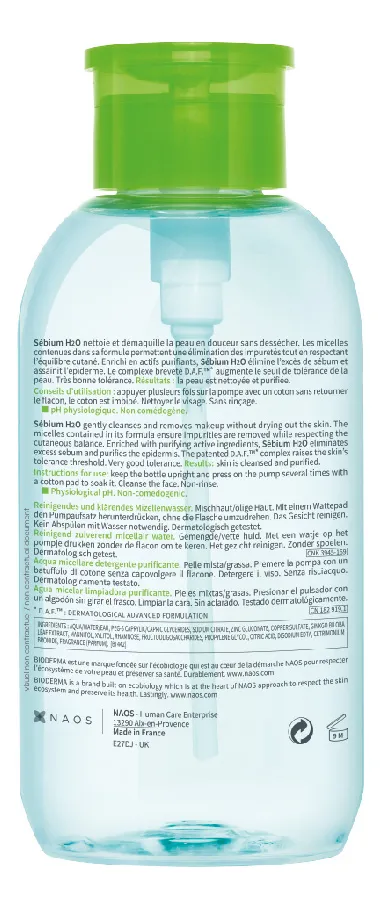 Sébium H2O es un agua micelar desmaquillante específica para pieles mixtas a grasas que imita la composición natural de la piel; desmaquilla perfectamente y con sumo cuidado incluso en las pieles más sensibles. Sébium H2O está enriquecido con agentes purificantes (gluconato de zinc y sulfato de cobre) para purificar la piel y limitar la secreción sebácea. El complejo natural patentado aumenta el umbral de tolerancia de la piel.