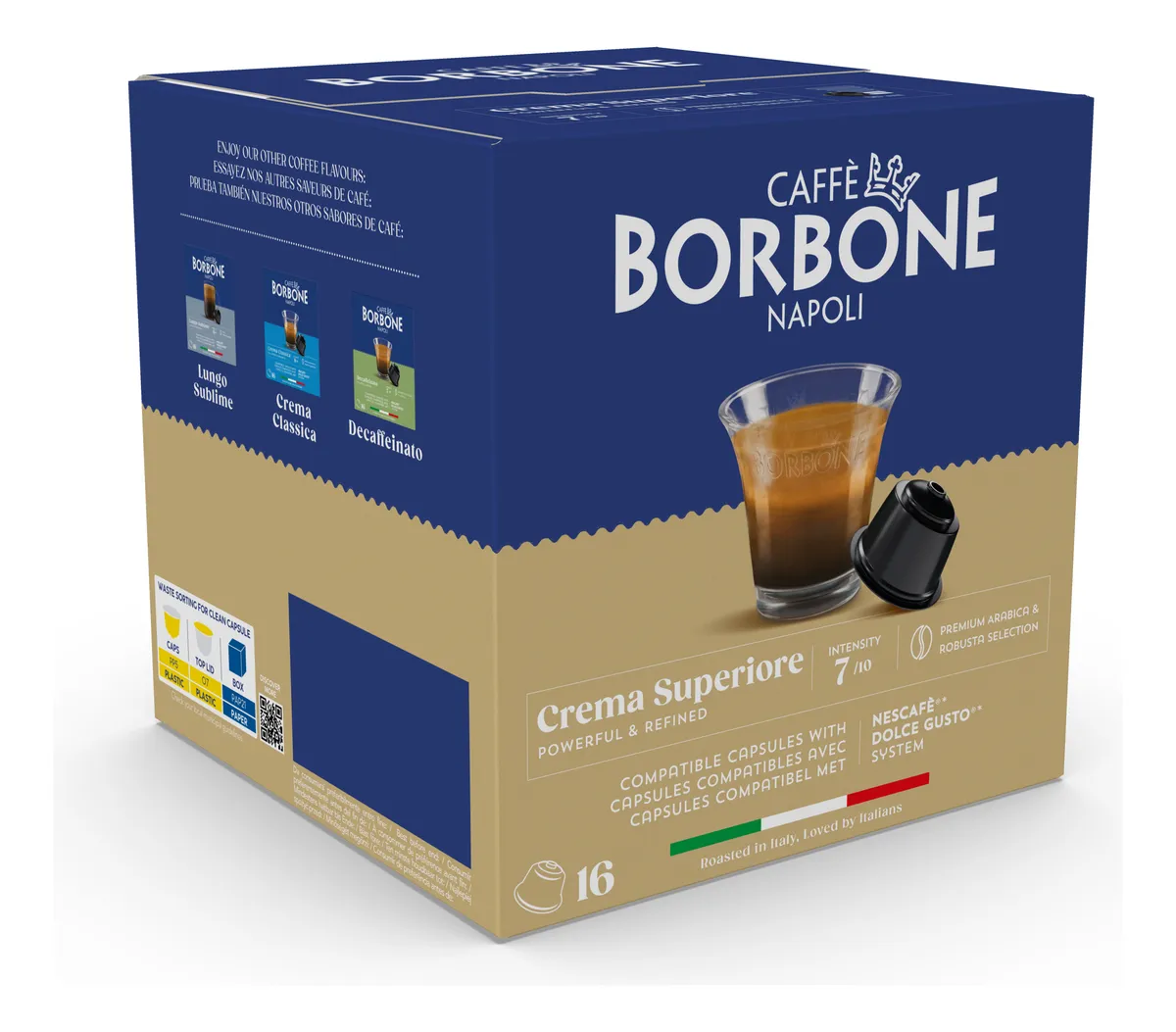 Las cápsulas de café Caffe Borbone Crema Superiore Dolce Gusto ofrecen una mezcla magistralmente equilibrada de granos premium de Arábica y Robusta, brindando una experiencia de café suave y con cuerpo en cada taza. Su perfil con predominio de Arábica aporta refinadas notas de chocolate con leche y vainilla, endulzadas naturalmente para un final armonioso. Con una intensidad de 7/10, esta mezcla logra el equilibrio perfecto entre riqueza y elegancia, ideal para quienes aprecian un café sofisticado y completo.