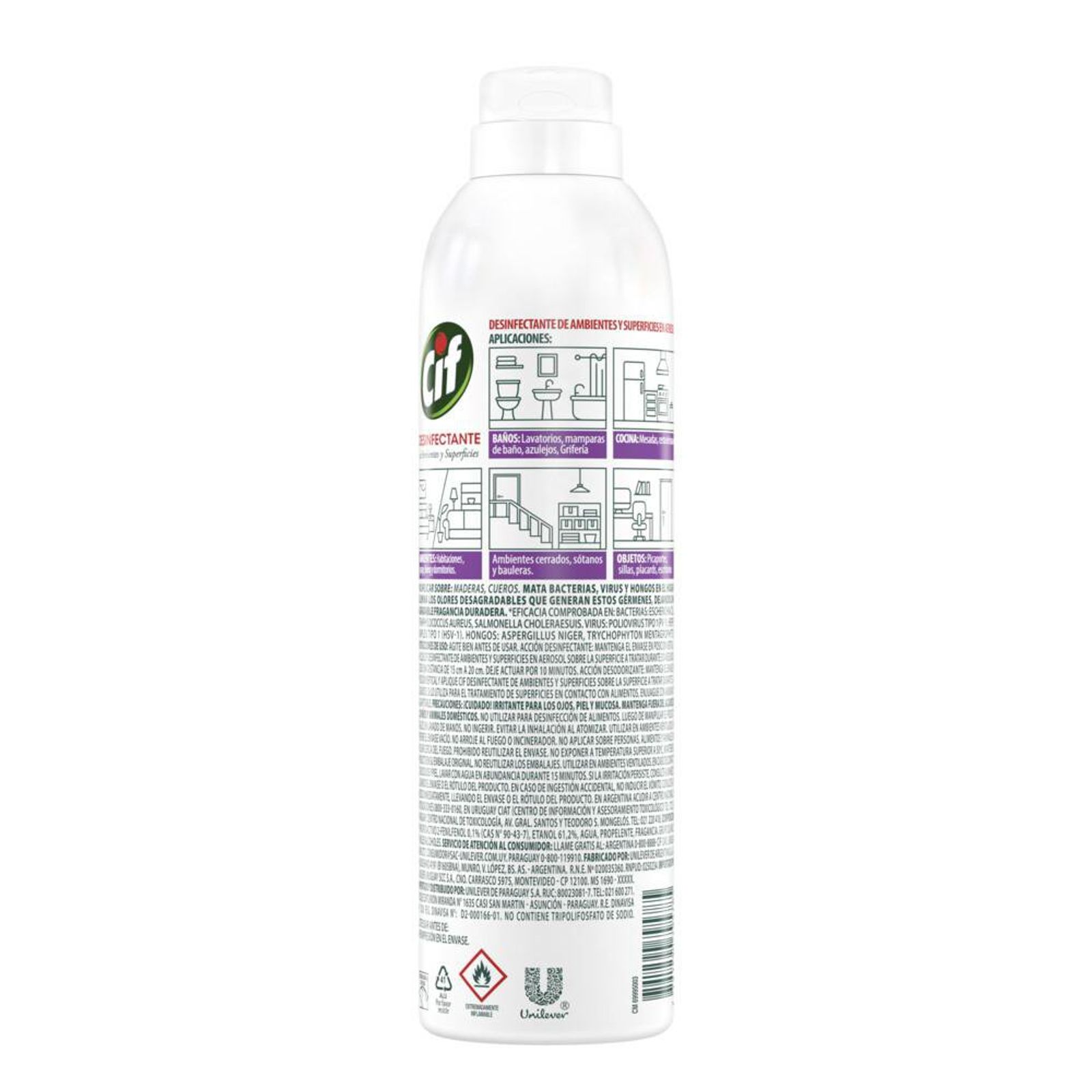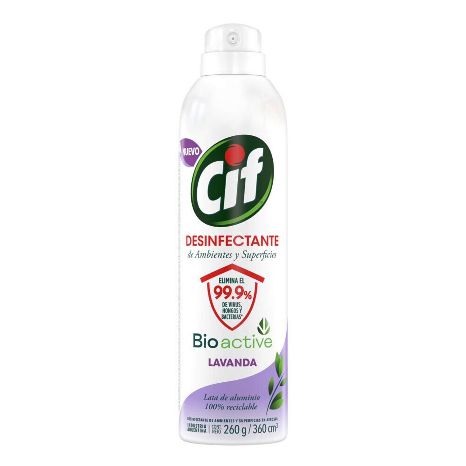 Aerosol Desinfectante Ambientes y Superficies CIF Lavanda. El nuevo Aerosol Desinfectante de Ambientes y Superficies CIF con su tecnología Bioactive y activo desinfectante biodegradable, elimina el 99,9% de hongos, virus y bacterias del hogar, brindando una limpieza y una desinfección profunda y una sensación de seguridad incomparable.