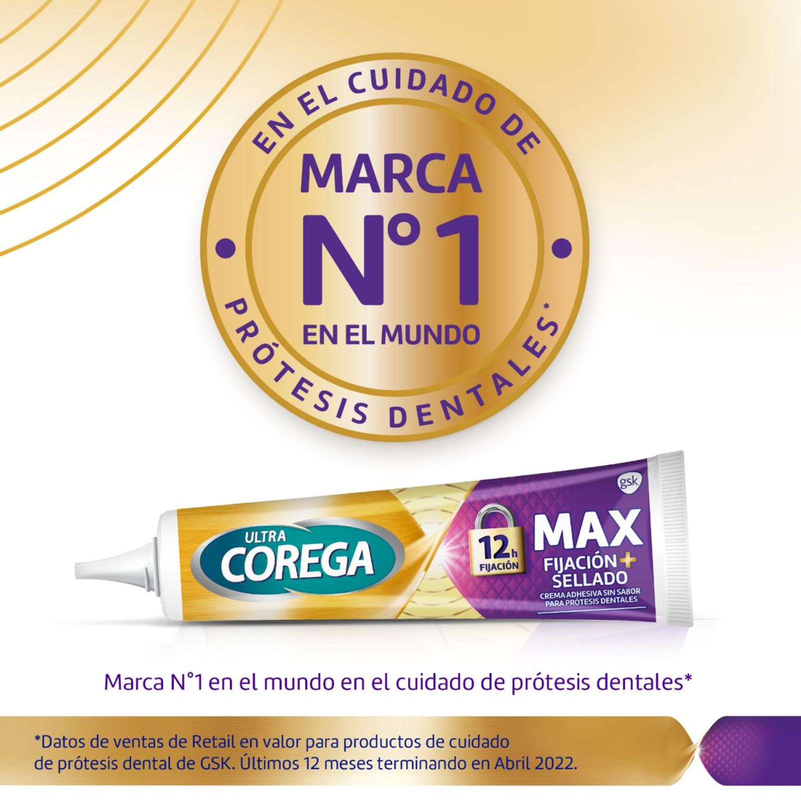 Bloquea hasta 5 veces más el ingreso de partículas de comida entre la prótesis y la encía.* Su nuevo pico facilita la aplicación y optimiza la cantidad a aplicar ayudando a evitar derrames. – Proporciona un sellado superior** que evita el ingreso de partículas de comida que irritan las encías. – Fijación fuerte durante todo el día. – Aumenta significativamente la fuerza de mordida.* – Otorga mayor ajuste y comodidad. – Su formulación no tiene sabor. Ultra Corega Crema Máximo Sellado fue diseñado para ayudar a sellar y proteger la boca de las partículas de comida que pueden causar la irritación de encías y, a su vez, proporcionar una fijación firme y duradera. El nuevo pico de precisión, con una punta más fina, permite aplicar la dosis necesaria de producto, lo que ayuda a evitar derrames y a obtener un sellado completo. Los beneficios de Ultra Corega Máximo Sellado hacen posible que tu prótesis no decida nunca más por vos lo que podés comer. Al ayudar a mantener la prótesis fija y cómoda, el adhesivo te da la libertad de disfrutar los alimentos que más te gustan. * Vs sin adhesivo. **En comparación con Ultra Corega Crema en prueba de laboratorio. Para Aplicar: 1) Lavá y secá la prótesis dental. 2) Aplicá el producto como se muestra en el dibujo. A)Prótesis superior: aplicá el producto en una tira continua larga, no muy cerca de los bordes de la prótesis. En el centro, aplique dos tiras más cortas en el medio de la prótesis dental. B)Prótesis inferior: aplicá el producto en una tira continua larga, no muy cerca del borde de la prótesis dental. C)Prótesis parcial: Aplicá 2 tiras cortas. 3) Enjuagá la boca antes de colocar la prótesis dental. 4) Colocá la prótesis dental correctamente en la boca , presioná firmemente y mordé durante algunos segundos para asegurarla. Para Remover: 1) Enjuagá tu boca con agua. 2) Quitá la prótesis suavemente con un movimiento para adelante y para atrás. 3) Remové los residuos del producto de la prótesis y de tu boca con agua tibia y con la ayuda de un cepillo suave.