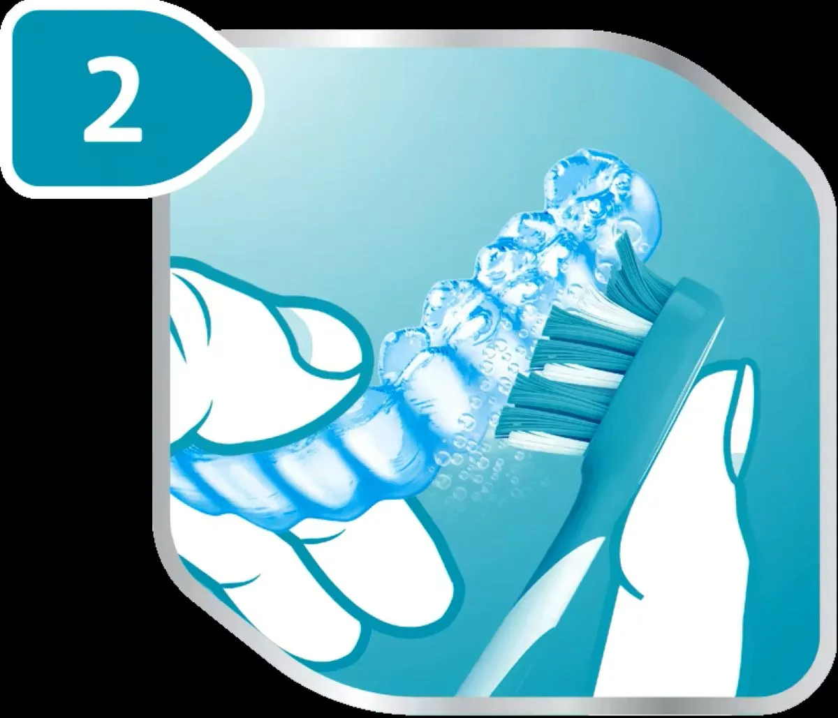 Deja el aparto dental removible en remojo en la solución efervescente durante 3-5 minutos. Para obtener mejores resultados, cepilla el aparato dental removible con la solución efervescente usando un cepillo suave. Desecha la solución restante inmediatamente después de su uso