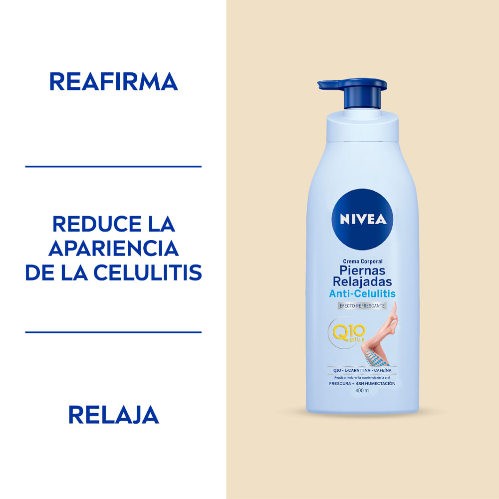 La Crema corporal anti-celulitis NIVEA Piernas Relajadas contiene Coenzima Q10, L-Carnitina y Cafeína que, después de dos semanas de uso regular, penetran y humectan profundamente la piel hasta por 48 horas. Su fórmula con Mentol (efecto frío), refresca y relaja las piernas, incluso se recomienda utilizarla en zonas con arañitas. Además, esta crema combina ingredientes activos que ayudan a reducir eficazmente la apariencia de la celulitis. Su aplicación con suaves masajes mejora la circulación. Está probada en todo tipo de pieles.