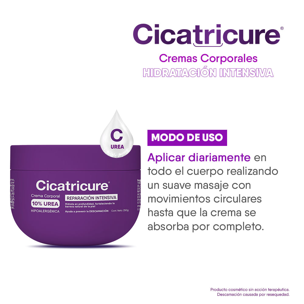 Crema corporal Cicatricure Reparación intensiva 10% urea. Hidrata en profundidad, fortaleciendo la barrera de la piel. Ayuda a prevenir la descamación.