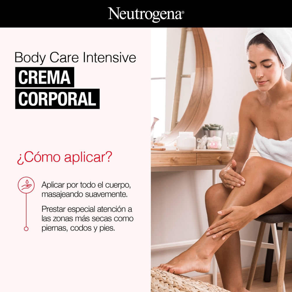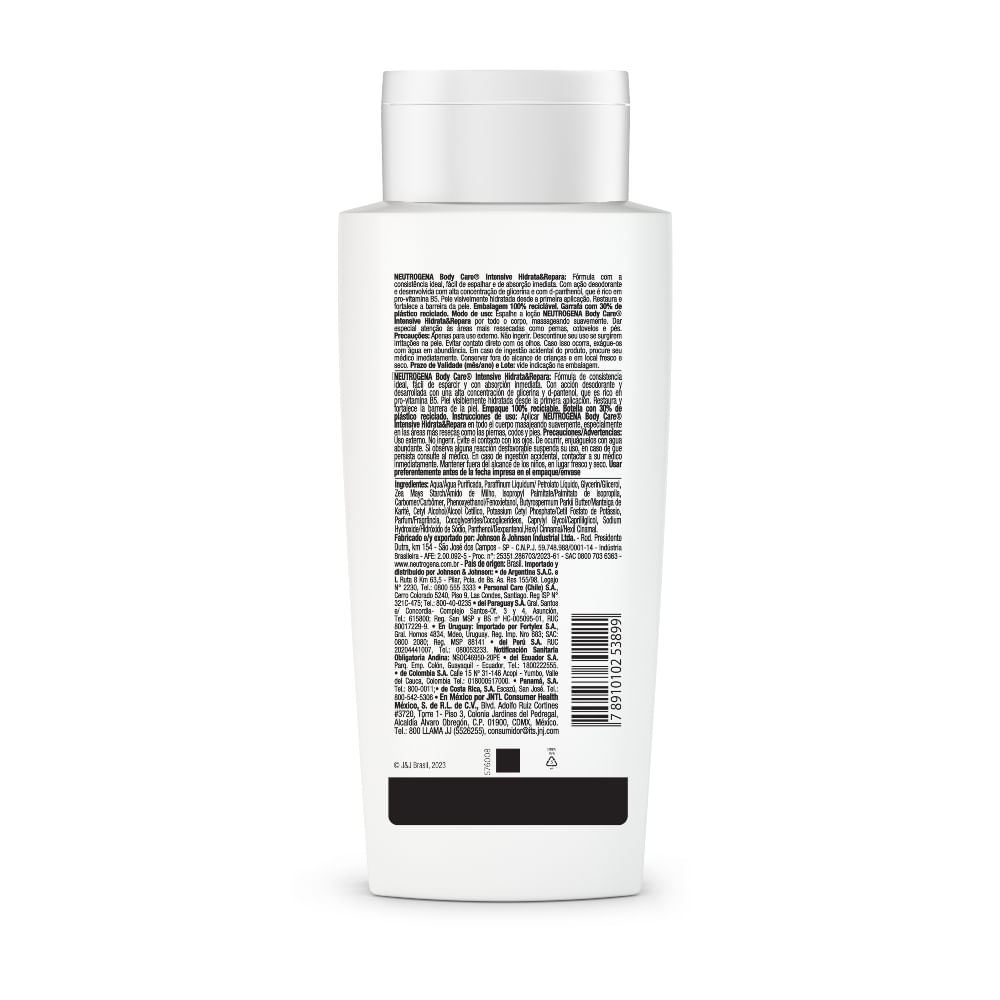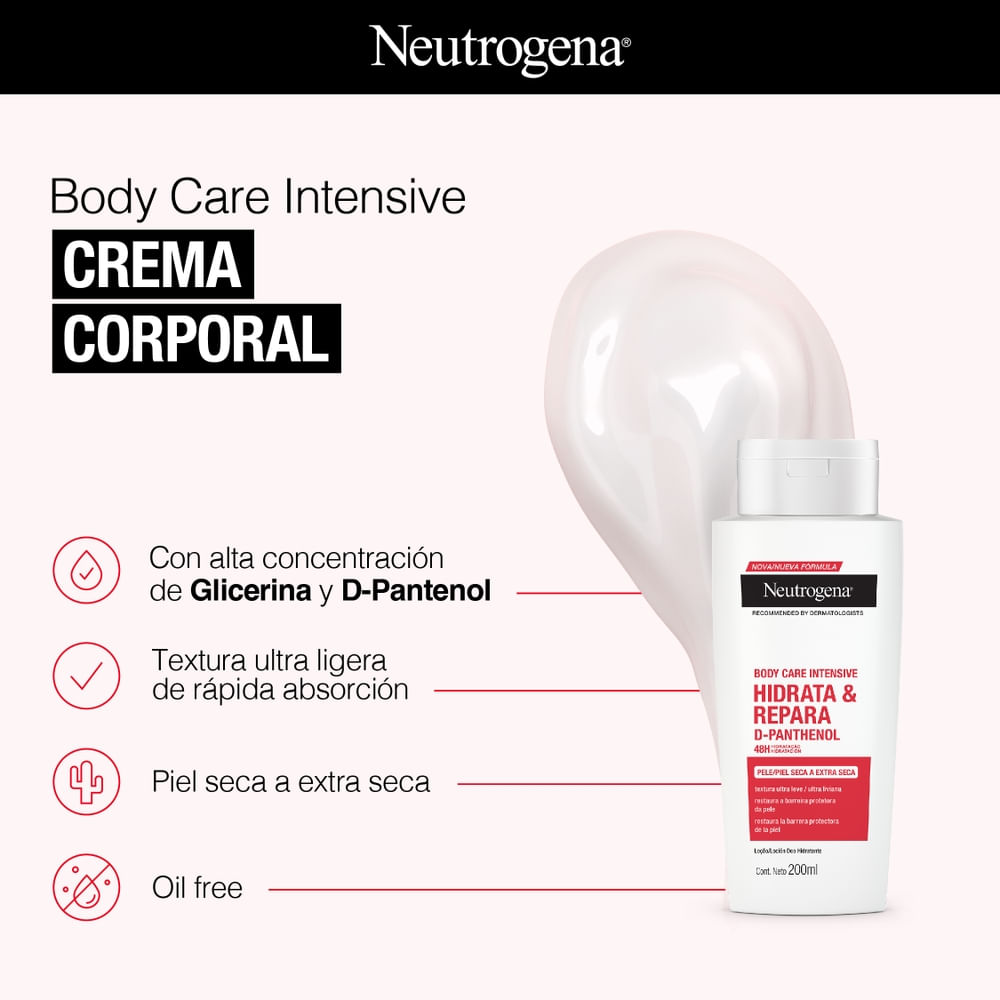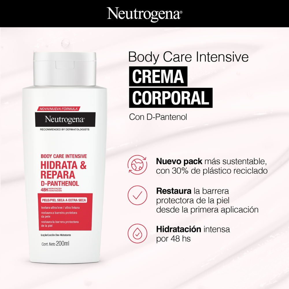 NEUTROGENA® Body Care Intensive Hidrata y Repara: Fórmula ligera, con acción desodorante y no grasa, desarrollada con una alta concentración de glicerina y D-pantenol, rica en vitamina B5. Acelera la regeneración celular, restaurando la barrera cutánea y mejorando su acondicionamiento. Loción desodorante hidratante que perfuma y desodoriza de forma segura todo tipo de pieles. Tecnología catiónica que ofrece una hidratación intensa con alta fijación apta incluso para las pieles más delicadas.