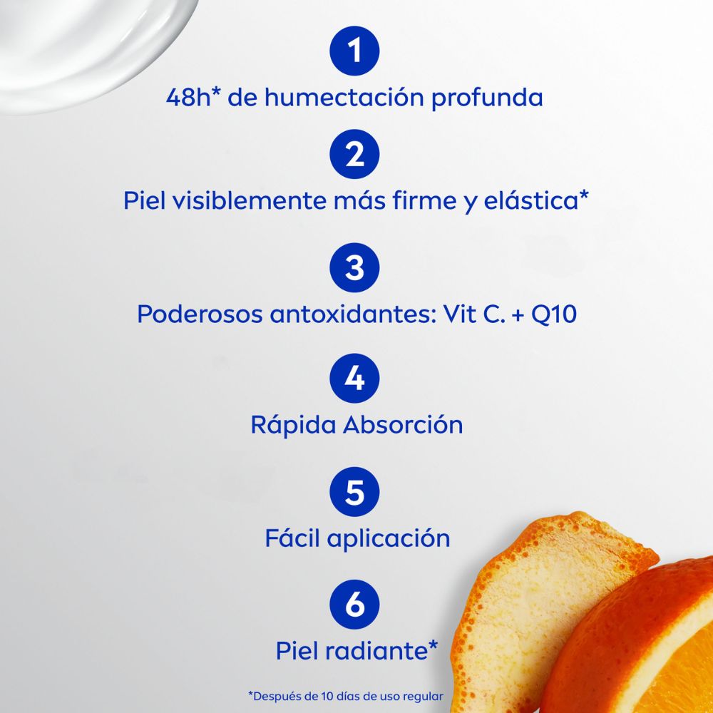 La Crema corporal NIVEA Q10 + Colágeno ofrece 6 beneficios en 1: 48 horas de humectación profunda, poderosos antioxidantes: Vit C + Q10, rápida absorción, fácil aplicación, piel visiblemente más firme, elástica y radiante. Su fórmula combina Coenzima Q10, Colágeno y Vitamina C, tres ingredientes que hidratan profundamente la piel y la suavizan. Su textura ligera es ideal para todo tipo de piel. NIVEA es la marca Nº 1 en el cuidado de la piel en el Mundo y en Argentina, con más de 100 años de trayectoria. Desde que inventamos la primera crema, NIVEA Creme, desarrollamos investigación constante para producir innovaciones que atiendan a cada necesidad de la piel de toda la familia. Nuestros investigadores se centran especialmente en la individualidad de la piel humana y en las diferentes necesidades de cuidado. Lo que ha dado como resultado que en las últimas décadas hayamos creado numerosos productos innovadores para el cuidado de la piel, desde desodorantes hasta productos de protección solar
