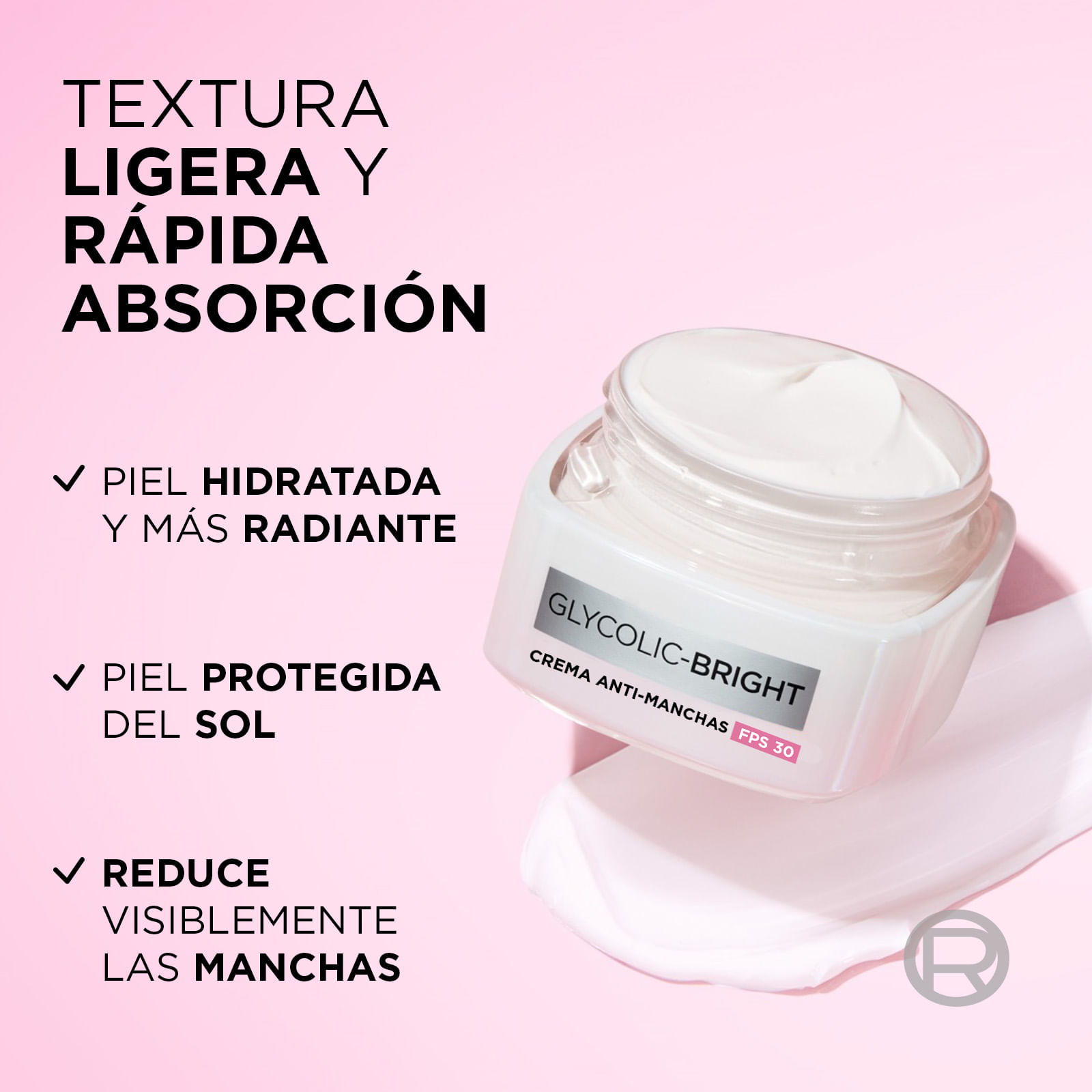 La Crema de día FPS30 Anti Manchas Glycolic Bright, formulada con ácido glicólico y niacinamida, ayuda a reducir y prevenir las manchas en la piel. Contiene alta protección solar FPS30, protegiendo la piel de los rayos UVB y UVA, para evitar manchas causadas por el sol y líneas de expresión. Su aplicación diaria logra una piel notoriamente más radiante y uniforme en tan solo 7 días.