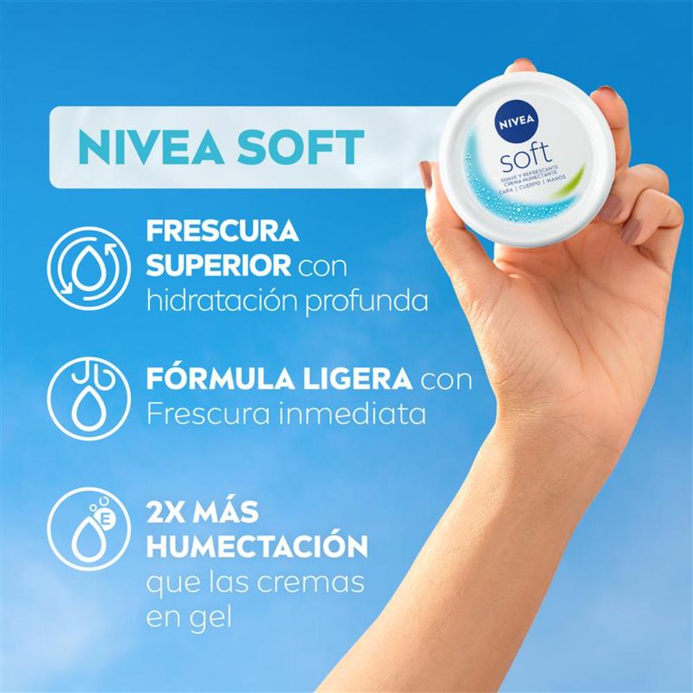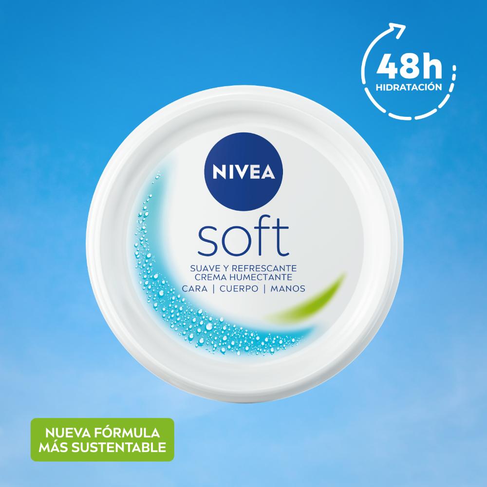 La Crema hidratante altamente efectiva NIVEA Soft proporciona una sensación vigorizante y refrescante para el uso diario. Su fórmula ligera combina Vitamina E y Aceite de Jojoba 100% natural, ingredientes que brindan 48 horas de hidratación intensa para un piel suave, con rápida absorción y sin dejar sensación grasosa. Contiene un 95% de ingredientes de origen natural y es completamente vegana. Los ingredientes de origen natural conservan más del 50% de su estado natural después de ser procesados, incluyendo el agua. Su compatibilidad con la piel ha sido dermatológicamente aprobada. Esta crema de uso diario es ideal para el cuidado y la protección de la cara, el cuerpo y las manos. Es adecuada para todo tipo de pieles NIVEA es la marca Nº 1 en el cuidado de la piel en el Mundo y en Argentina, con más de 100 años de trayectoria. Desde que inventamos la primera crema, NIVEA Creme, desarrollamos investigación constante para producir innovaciones que atiendan a cada necesidad de la piel de toda la familia. Nuestros investigadores se centran especialmente en la individualidad de la piel humana y en las diferentes necesidades de cuidado. Lo que ha dado como resultado que en las últimas décadas hayamos creado numerosos productos innovadores para el cuidado de la piel, desde desodorantes hasta productos de protección solar.