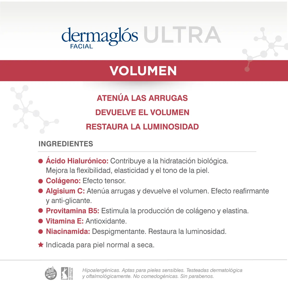 Hipoalergénica – Apta piel sensible – Testeada dermatológica y oftalmológicamente – Sin TACC – Sin parabenos – No testeado en animales