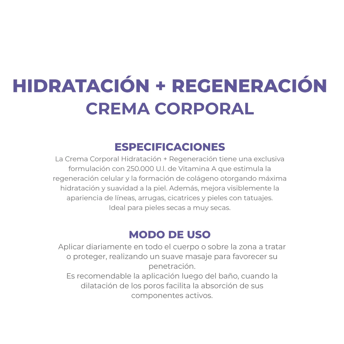 Su fórmula con 250.000 U.I. de Vitamina A ayuda a reparar la piel deshidratada dejándola suave, elástica y saludable. Estimula la regeneración celular y la formación de colágeno, contrarrestando el proceso de envejecimiento de la piel. Mejora visiblemente la apariencia de líneas, arrugas, cicatrices y pieles con tatuajes. Ideal para talones, rodillas, codos y zonas específicas. Indicada para piel seca y muy seca.