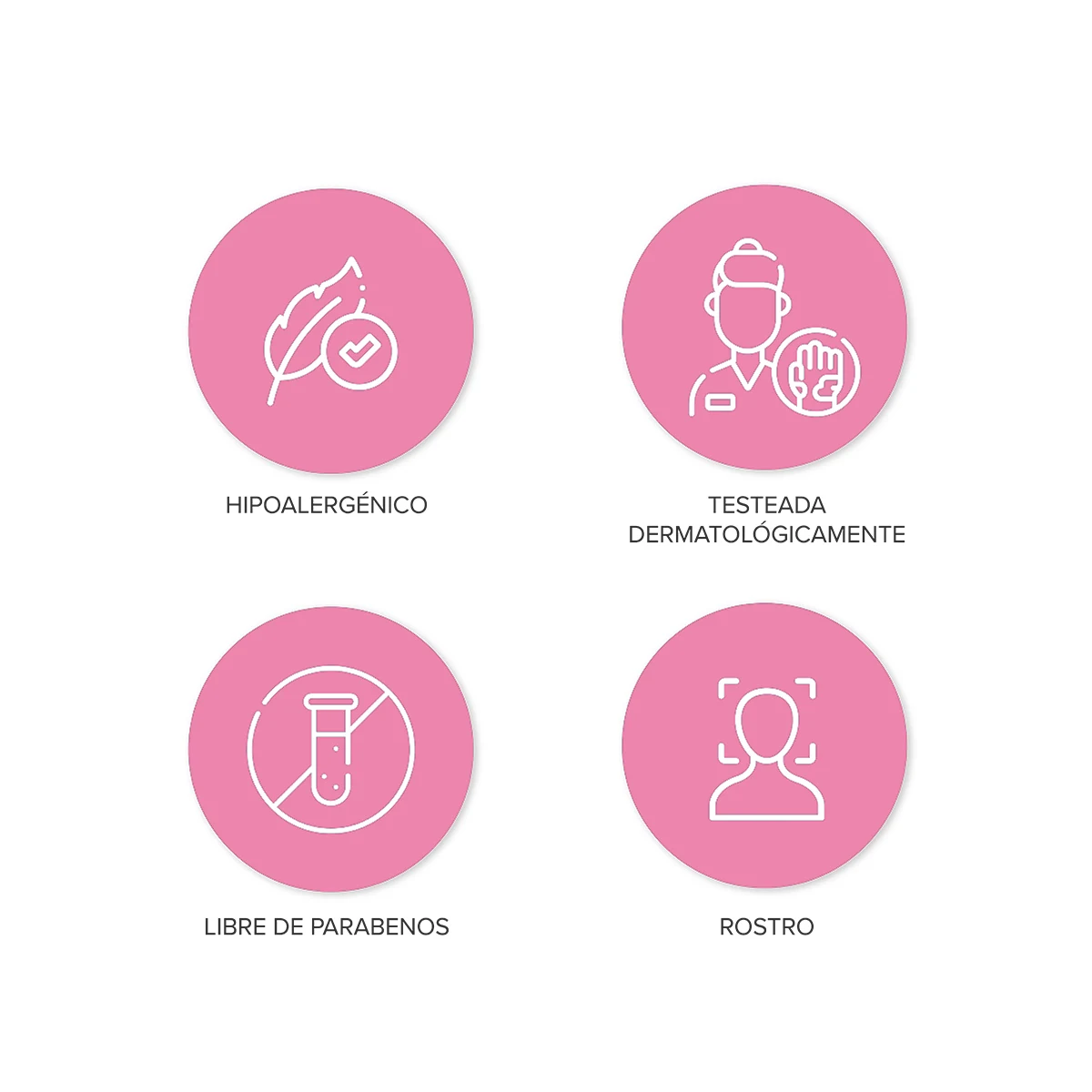 Hipoalergénica – Apto piel sensible – Testeada dermatológica y oftalmológicamente – No comedogénica – Sin TACC – Sin parabenos