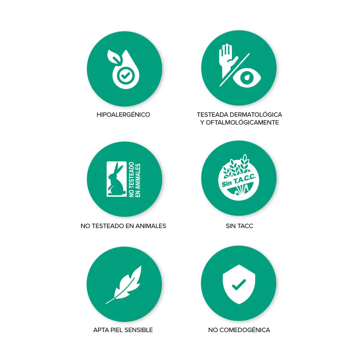 Hipoalergénico – Apto piel sensible – Testeado dermatológica y oftalmológicamente – No comedogénico – Sin TACC – Sin parabenos – No testeado en animales