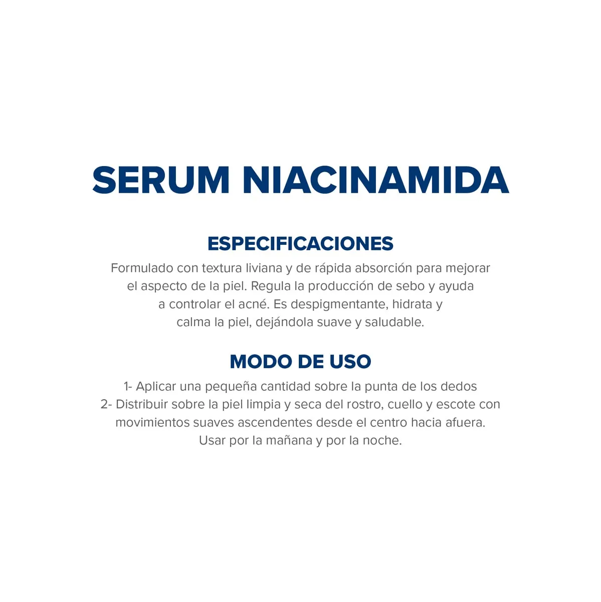 Formulado con Niacinamida al 10%, es un Serum de textura liviana y de rápida absorción para mejorar el aspecto de la piel. Regula la producción de sebo y ayuda a controlar el acné. Es despigmentante, hidrata y calma la piel, dejándola suave y saludable.