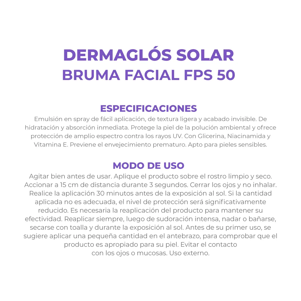 Emulsión en spray de fácil aplicación, de textura ligera y acabado invisible. De hidratación y absorción inmediata. Protege la piel de la polución ambiental y ofrece protección de amplio espectro contra los rayos UV. Con Glicerina, Niacinamida y Vitamina E. Previene el envejecimiento prematuro. Apto para pieles sensibles.