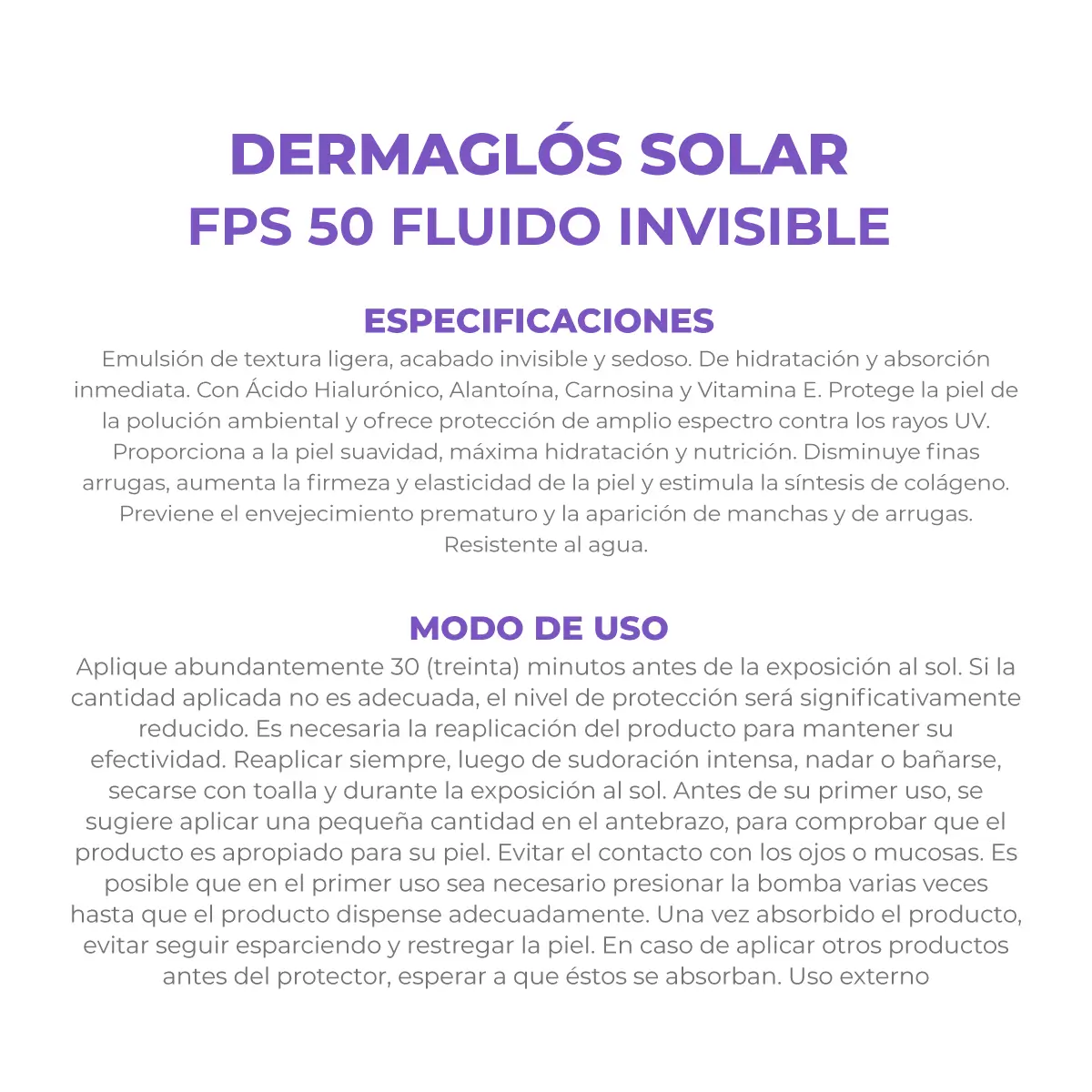 Emulsión de textura ligera, acabado invisible y sedoso. De hidratación y absorción inmediata.