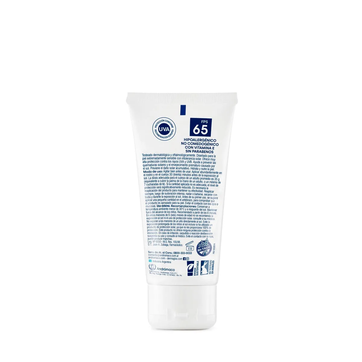 Testeado dermatológicamente y oftalmológicamente. Hipoalergénico. No comedogénico. Sin TACC. Sin parabenos. No testeado en animales. respetuoso con los océanos. Resistente al agua. Recomendado a partir de los 6 meses. Sin perfume.
