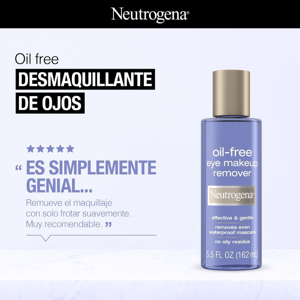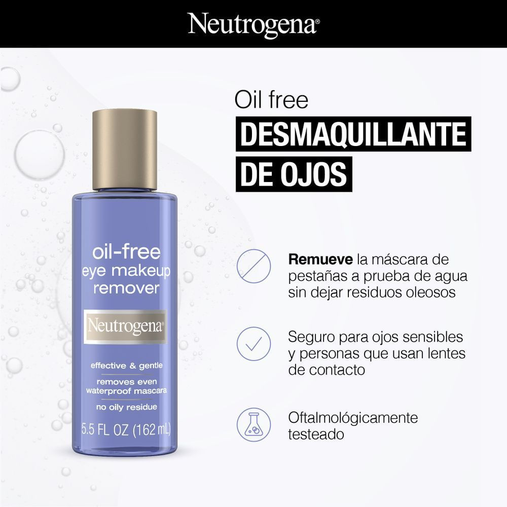 El desmaquillante de ojos NEUTROGENA® Oil Free Desmaquillante Líquido de doble fase, 100% libre de grasa, elimina suavemente hasta el maquillaje a prueba de agua sin ningún esfuerzo. Los extractos de aloe y pepino suavizan la piel