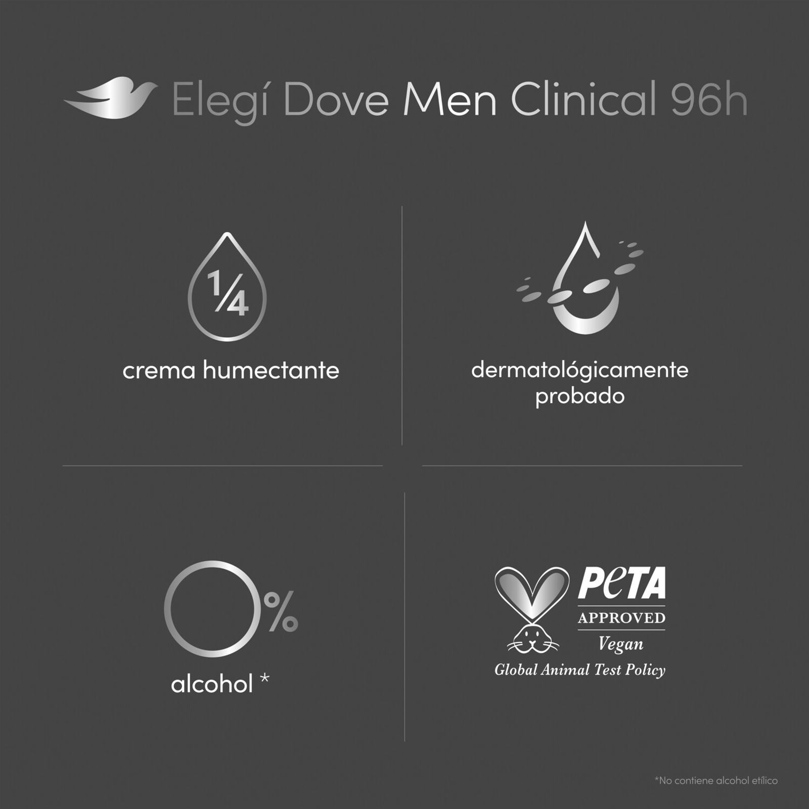 Nuevo antitranspirante en aerosol Dove Men+Care Clinical (150 ml). Su fórmula avanzada ofrece una protección efectiva contra la transpiración y el mal olor. Posee una tecnología avanzada, desarrollada específicamente para prevenir la transpiración excesiva y brindarte todo el cuidado para tus axilas. Su exclusiva tecnología forma un micro escudo de protección que dura hasta por 96 horas. Un antitranspirante 3 en 1: anti sudor, olor e irritación. Para que sientas máxima seguridad, protección y cuidado. Dove Clinical te da 3 veces más protección vs. un antitranspirante básico ¿Cuál es el producto más importante que utilizas? Para muchos, la respuesta a esa pregunta sería un buen antitranspirante potente contra la transpiración. El antitranspirante Dove Men+Care Clinical ofrece una máxima protección contra la transpiración con todo el cuidado de Dove. ¡PROTECCIÓN + CUIDADO! Dove Men+Care Clinical combina ¼ de crema humectante que humecta la piel de tus axilas y ayudan a combatir el daño y la irritación. Además, tiene 0% alcohol. Toda la línea de Dove es hipoalergénica y está probada dermatológicamente. Para un rendimiento óptimo sugerimos aplicar el producto de noche, ya que le permite formar un mayor nivel de protección cuando tu cuerpo descansa. Para una mejor protección duradera: después de la ducha, asegúrate que tus axilas estén completamente secas. Luego agita el envase para mezclar homogéneamente los ingredientes protectores y nutritivos. Finalmente, levanta tu brazo y aplica el producto en tu axila, a no menos de 15 cm de la piel. Aplicar una vez al día, no necesita reaplicar. Dove Men+Care Clinical cuenta con certificación vegana y no testea en animales.