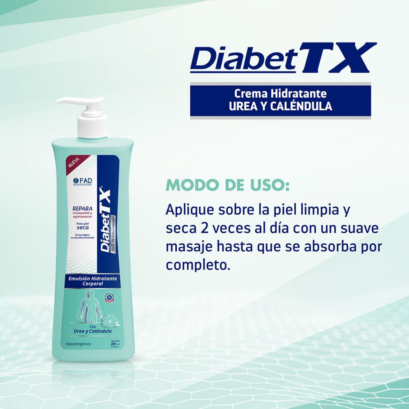 Emulsión corporal Diabettx PLUS 5% UREA hidrata la piel de los pies, codos y manos. Especialmente formulada para la piel de personas que padecen diabetes BENEFICIOS – REPARA: Repara resequedad y agrietamiento – HIDRATA: Hidrata inmediatamente la piel, ayudando a prevenir lesiones – UREA 5% – CALÉNDULA: Componente natural de la piel con propiedad hidratante que la protege y extracto de caléndula, reconocido acondicionador que suaviza y alivia la piel – RESEQUEDAD: Repara la resequedad más extrema con solo 1 aplicación. Mejora notablemente las condiciones de la barrera cutánea. MODO DE USO: Aplique sobre la piel limpia y seca 2 veces al día con un suave masaje hasta que se absorba por completo