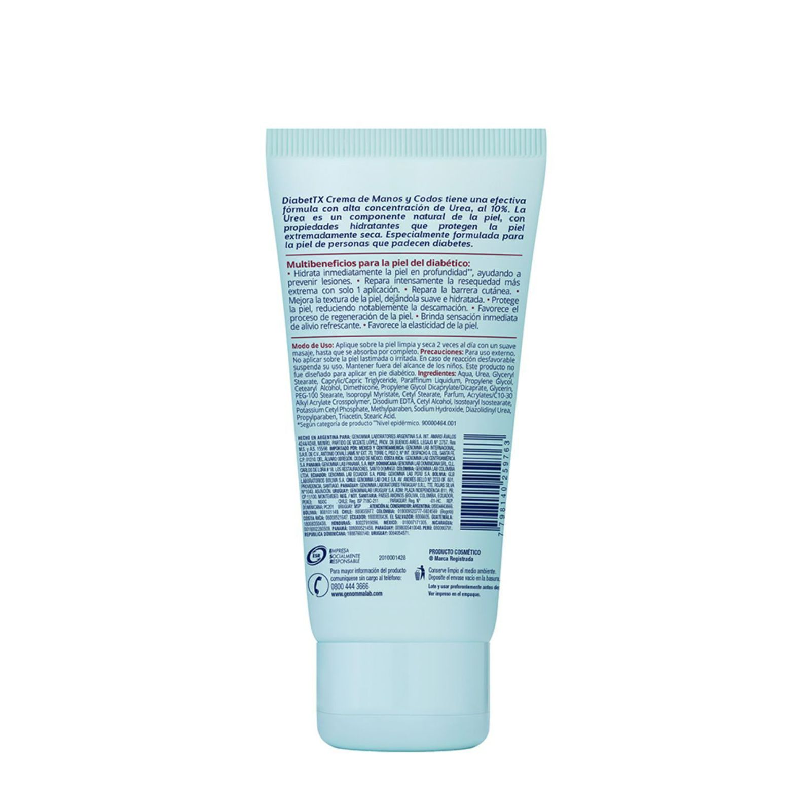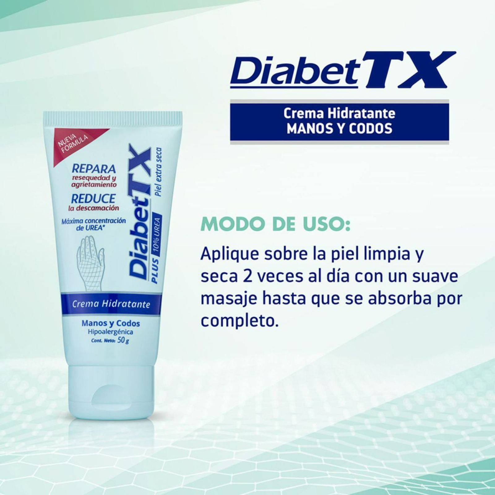 Crema hidratante para manos y codos DiabetTX. Repara resequedad y agrietamiento, reduce la descamación. Plus urea 10% para pieles extra secas BENEFICIOS – REPARA: Repara resequedad y agrietamiento – REDUCE: Reduce la descamación – 10% UREA: Máxima concentración de urea – RESEQUEDAD: Repara intensamente la resequedad más extrema con solo 1 aplicación MODO DE USO: Aplique sobre la piel limpia y seca 2 veces al día con un suave masaje hasta que se absorba por completo