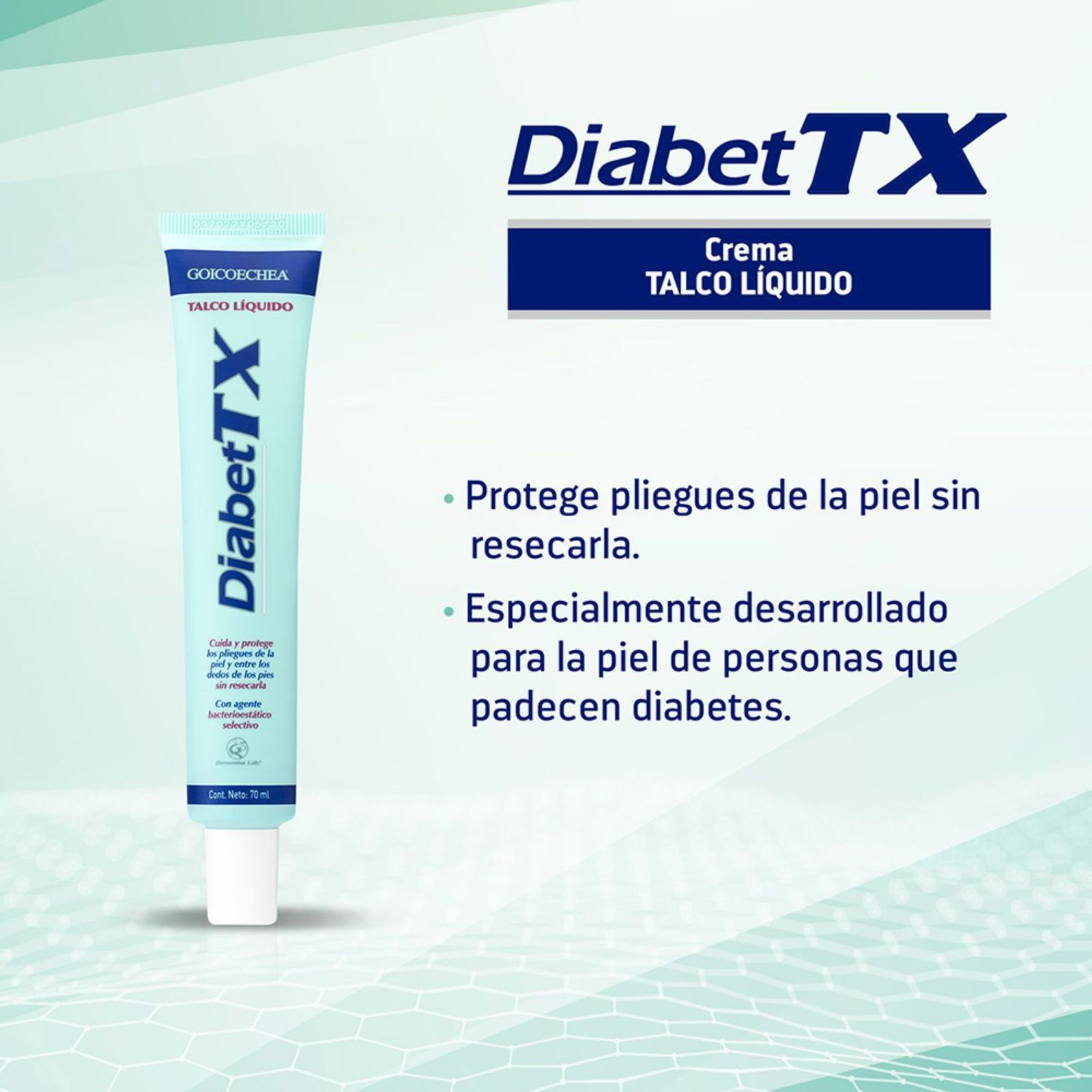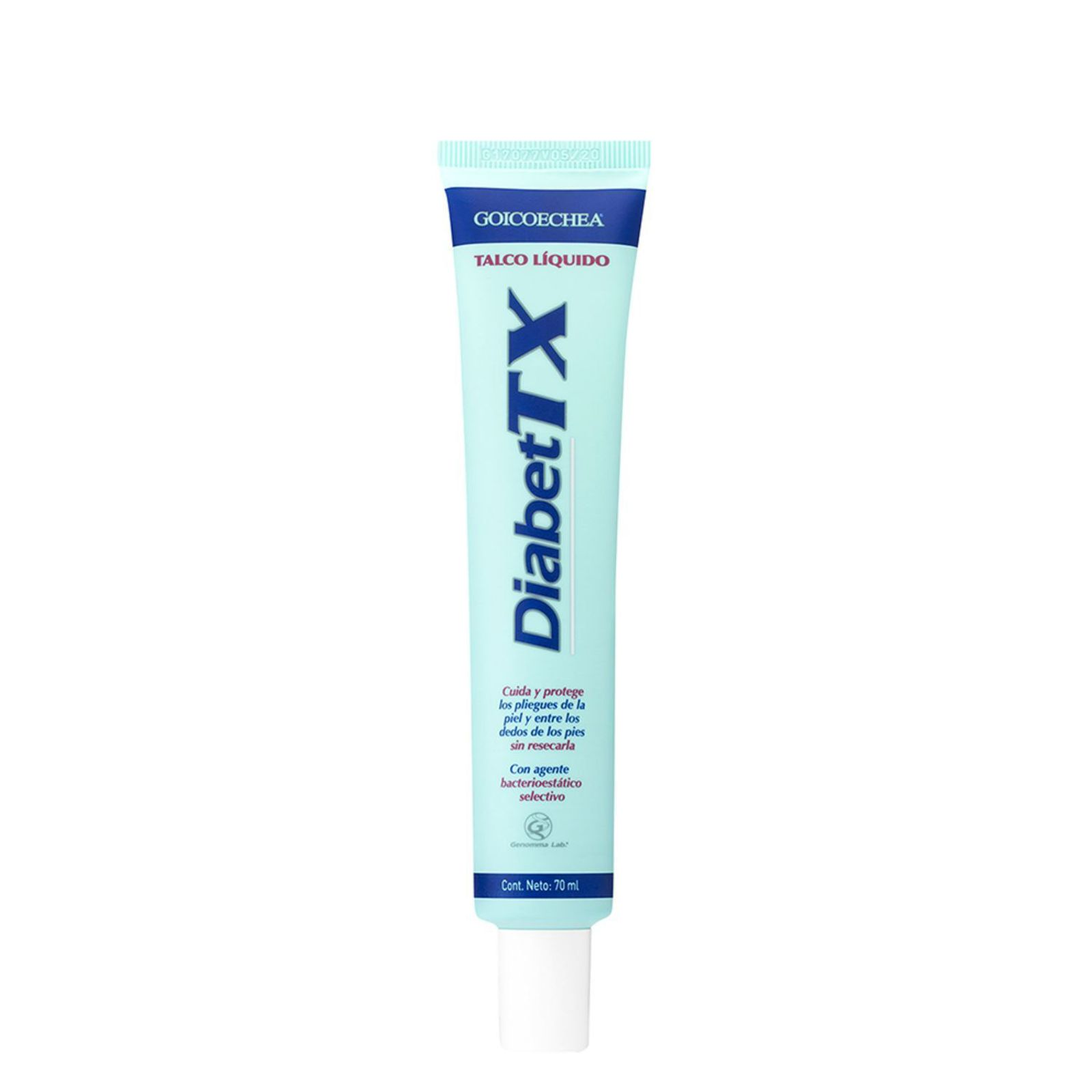 DiabetTX talco líquido es una emulsión que protege los pliegues de la piel, diseñado especialmente para las personas que padecen diabetes. BENEFICIOS – PROTEGE: Pliegues de la piel sin resecarla – DIABETES: Especialmente desarrollado para la piel de personas que padecen diabetes – FÓRMULA: Su ingrediente activo, almidón de tapioca, genera una película residual de polvo absorbente sobre la piel dejándola seca y suave – ACCIÓN: ayuda a proteger la piel del mal olor MODO DE USO: Aplique sobre la piel limpia y seca en las zonas de los pliegues. Esparcir el producto con la mano.