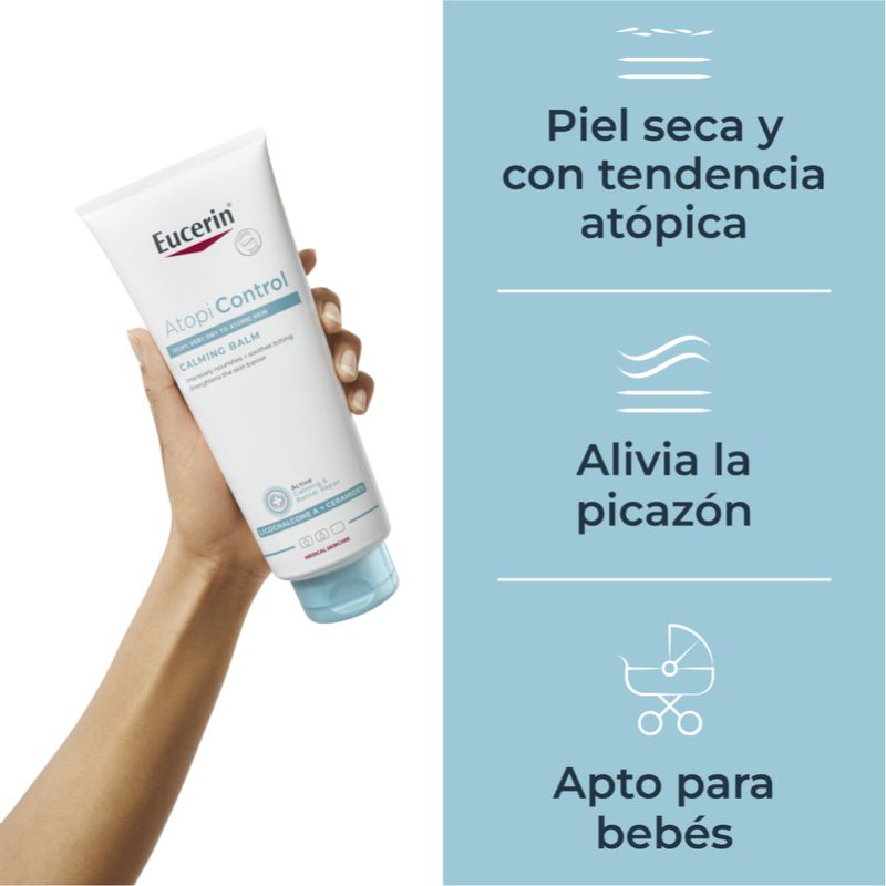 El Bálsamo corporal Eucerin AtopiControl es un producto de uso diario que proporciona una hidratación instantánea para que la piel esté suave y tersa. Su fórmula combina tres ingredientes: Licochalcona A, Ceramidas y Manteca de Karité para reforzar la barrera de la piel y aliviar la sequedad. Este bálsamo nutritivo de aceite en agua tiene una textura ligera y agradable que se absorbe rápidamente. Es adecuado para adultos, niños y bebés de más de tres meses.