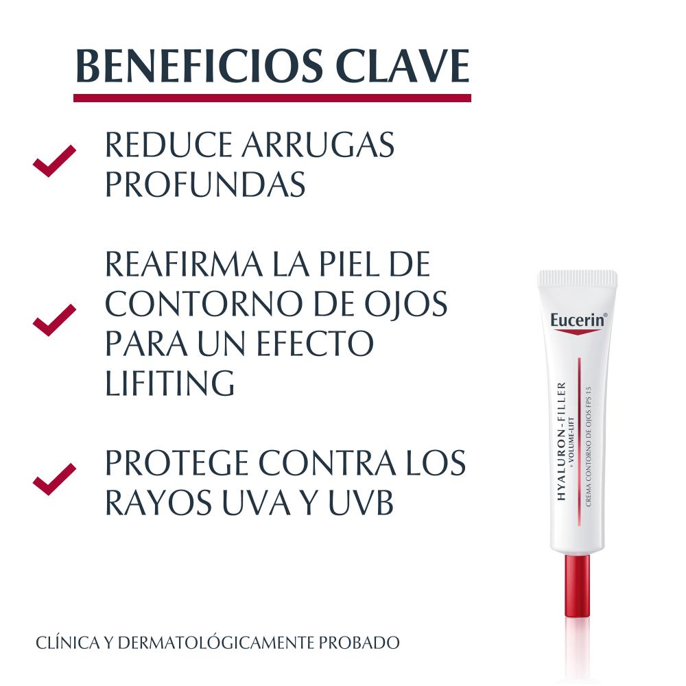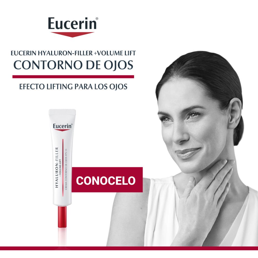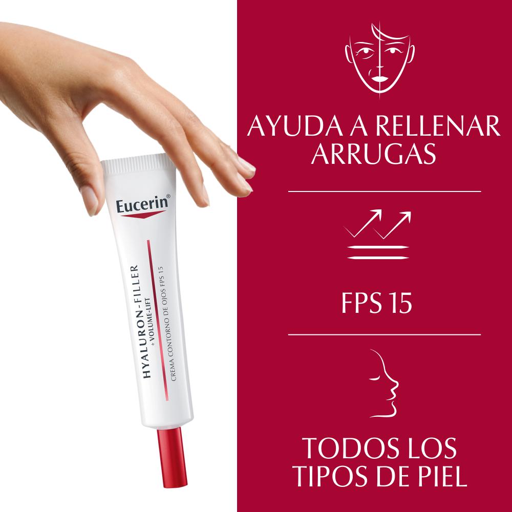 El Contorno de ojos Eucerin Hyaluron-Filler + Volume-Lift actúa sobre las arrugas y flacidez causadas por la pérdida de volumen especialmente en la delicada área de los ojos. Por eso, esta crema voluminizadora reafirma la piel para un efecto lifting. Su fórmula combina tres ingredientes activos: Extracto de Magnolia natural que aumenta el tamaño y el número de las células que estimulan el volumen; los Oligopéptidos que mejoran la renovación de colágeno; y el Ácido Hialurónico que humecta la piel y reduce las arrugas. Además, contiene FPS 15 con un sistema de filtros UVA para proteger la piel del fotoenvejecimiento. Está probada oftalmológicamente y es apta para todo tipo de pieles.
